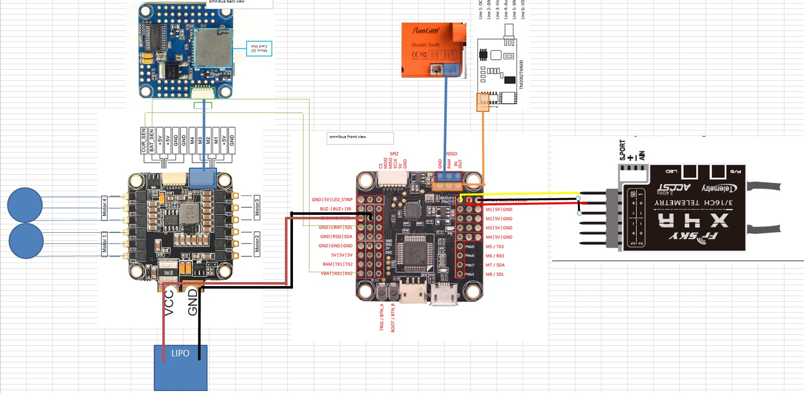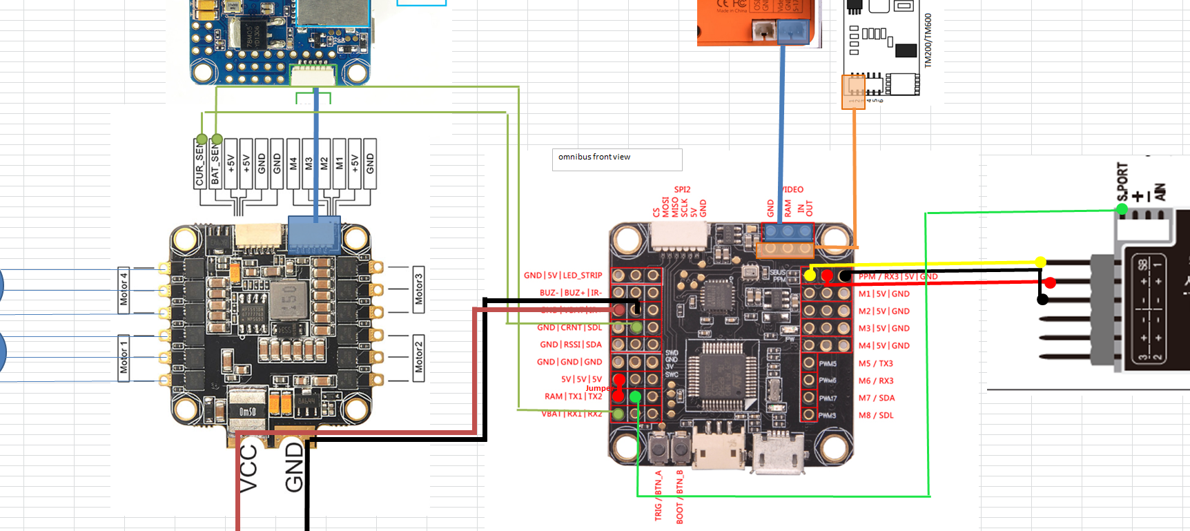 Leurne Posté(e) Mai 10, 2017 Auteur Signaler Posté(e) Mai 10, 2017 Il y a 7 heures, DaD a dit : y'a beaucoup de choses dans ton message, pas facile de répondre à tout... Liste du matos : Moteur => 2204 c'est trop peu, passe au mini sur du 2205. Lipos => Passe direct au 4S, 3S c'est vraiment foutre du pognon par les fenetres, dans un ou deux mois tu voudra changer tout ça. Et très franchement, aussi bizarre que ça puisse paraitre au début 4S est plus facile à piloter. TX => La Taranis Q7 à très bonne presse. Tu pourras la garder longtemps. Câblage : Y'a des endroit où on voit pas, tu as fais des traits dessus Sur quel borne connecte tu la lipo sur la FC? idem pour le RX? Tu devrait relier la sortie cur_sen à l'entrée current de ta FC, comme ça tu auras la conso temps réelle dans l'OSD... c'est top ça... Pareil pour le Vbat de la FC, il devrait être relier à BAT_SEN pour avoir le voltage en temps réell dans l'OSD. on voit pas très bien, mais c'est simple. Signal Caméra sur Vin de la FC, Signal VTX sur le Vout de la FC. Ensuite tu aliment en courant le VTX avec RAM et ground. Pour la caméra, soit tu rapart de ton VTX pour l'alimenter, soit tu repart de la FC avec RAM & ground tout dépand de ce que ta cam peux supporter. Idéalement, il est conseiller d'avoir un ground commun pour la cam et le VTX. non, cette connectique c'est pour brancher la mini manette pour régler la cam. Tiens j'ai mis en plus gros et en PNJ comme ca la qualite est meilleure. -LIPO:La lipo est relie sur la borne du controller : GND (noir) et VBAT (rouge).- CAMERA-VX : J'ai matte une video youtube hier qui explique comment alimenter le port camera en VX. On peut soit envoyer du 12V soit envoyer du 5V en fonction d'ou on place le jumper: VBAT-RAM : 12V sur la camera/rx 5V-RAM : 5V sur la camera RX Il faudra que je reconfirme ca par mesure de tension sur les born RAM-5v comme cela: Bon sinon ici on est cable comme suivant: Concernant ce point, jai quand meme une inquietude car la video sur youtue que j'ai vu (channel Project Blue Falcon, video: Adding Camera & Vtx to omnibus OSD, desole la jsuis sur l'ordi du taf donc pas de VPN pour vous mettre le lien.... comme youtube est bloque en chine....) ils disent que deja: 1- ce qui fait chier sur cette carte c'est que soit tu as du 5v soit du 12v, mais tu peux pas avoir du 5v sur une borne et du 12v sur l'autre. mais si on veut vraiment du 5v et du 12v, on peut directement aller se cabler sur les borns VBAT et ram. 2- l'omnibus flip32 dit que c'est du 5volt filtre. alors qu'a priori c'est faux. La j'avoue je vois pas trop le probleme... il parle de qualite de l'image.... 3- il dit aussi que le transfo en 5v semble chauffer a mort. Il y a deja eu des cas ou ca a fondu. Donc ma question est: puis-je chopper du 5volts ailleurs? Je vois qu'a la sortie de ma 4in1 ESC j'ai des sorties 5v qui ne me servent pas.. Il conseille d'avoir un PDB.... Qu'en pensez vous? PDB+4in1+flight controller ?@DaD : GND commun? C'est a dire cable sur le meme GND?- RX : Petit changement sur le RX comme d'apres la video de la meme chaine je dois cabler la sortie S.PORT vers l'UART (TX1 ou 2) Donc branchement : Sortie RX SBUS = entree Omnibus Sbus Sortie RX + = Entree Omnibus 5V Sortie RX - = Entree Omnibus GND Sortie RX Petit cable sur le cote S.PORT = Entree Omnibus TX1 -4in1 ESC : Ca semble un peu plus simple ici. Comme tu dis DaD, je branche le cur_sen vers CRNT et BAT_SEN vers VBAT. Pour le VBAT j'ai choisi le 2eme qui est relie au VBAT du haut (la ou je branche la LIPO). A confirmer par mesure au multi parceque c'est du deduit d'une video youtube et pas sur que jai le meme constructeur, meme si il semblerait quelle soit identique. La 2eme nappe comme on voit sur mon schema merdique elec, elle va se brancher directement sur la nappe de l'autre cote du FC.https://world.taobao.com/item/547482143112.htm?fromSite=main&spm=a312a.7700824.w4002-250920704.12.kg5BIN Ici le schema de branchement du FC au cas ou : et voila! Un post mega long! J'espere les branchements sont correctes et que ca pourra aider d'autres personnes