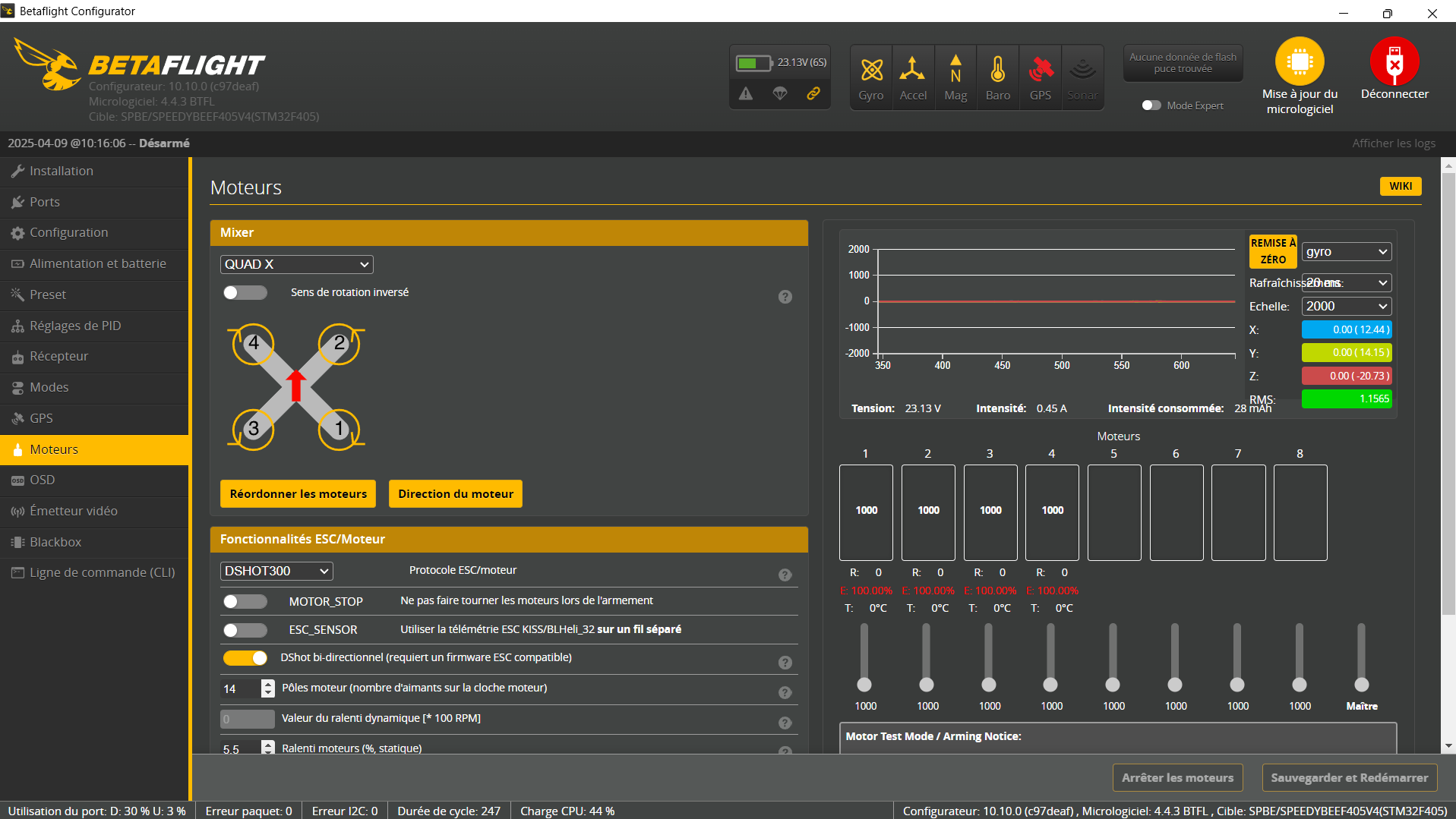 alors oui mon test est effectué sur betaflight 10.10.0 sans hélices, avec RX frsky sbus XM+, en protocole ESC/Moteurs DSHOT300, j'ai une stack SpeedyBee f405V4 et j'ai 14 aimants sur les cloches de mes moteurs .