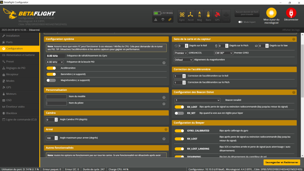 Bonjour, depuis le MAJ 4.3 sous BF10.8, j'ai ce problème du drone qui fait n'importe quoi, meme en suivant toutes ces étapes, le drone continu de faire n'importe quoi dès que j'arm...avez vous trouvé une autre solution depuis ?