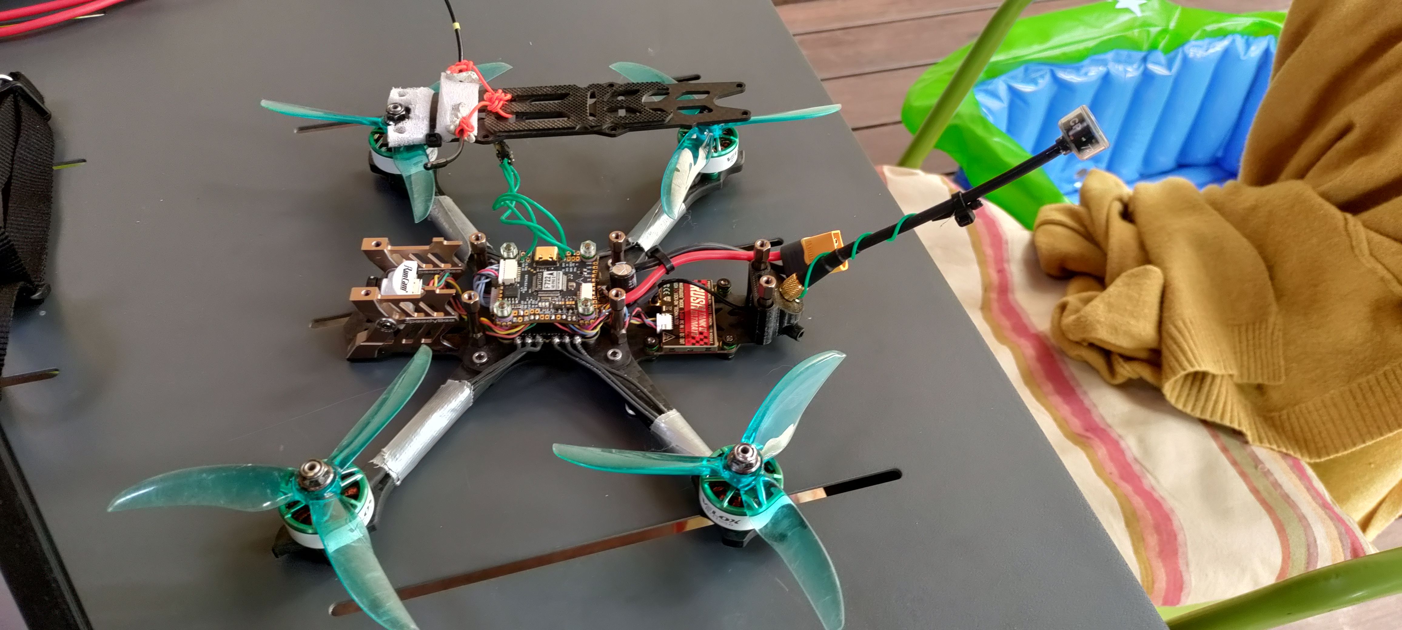 leyo Posté(e) Juin 7, 2022 Signaler Posté(e) Juin 7, 2022 Topic Attachments Bonjour à tous ! Après de nombreuses heures de simulateur, tout autant d'heures de vol avec un petit drone déjà monté, j'ai eu envie de passer aux choses sérieuses et de me monter un engin plus gros, plus puissant, et surtout plus fait-maison. J'ai donc prospecté, regardé et lu moulte tutos, soigneusement fait ma sélection de pièces détachées et je me suis lancé. Je vous présente donc mon premier montage, accompagné quelques-unes de mes réflexions, de mes premiers succès et de mes premières erreurs : Mon objectif : avoir une machine qui me fait me dire "wow." Mes contraintes : passer par un vendeur plus ou moins local, ayant du stock sur place, pour des livraisons plus rapides et potentiellement avoir un SAV fr (l'écologie c'est bien, mais je sais que mes pièces seront produites en Chine peu importe chez qui je les commande). Je choisi le standard, 5'', et décide que ce sera 6S, parce que pourquoi pas. Une fois tout ça défini, et les autres composants sélectionnés, j'ai passé ma commande (voir la liste, le vendeur est facilement identifiable, et je ne peux que louer la vitesse à laquelle il a expédié mes différentes demandes). Quel bonheur de tout ouvrir, de voir le projet se concrétiser ! "Je suis prêt, je sais où vont les choses et ce qu'elles font, je sais souder, et si jamais je sais me renseigner". C'est pas vrai. Les erreurs s'enchainent : - je coupe les câbles des moteurs trop court, TOUS, d'environs 3-5mm. -> fuck it, je fais avec - pas de place pour l'antenne rx -> bricolage d'un support en polystyrène, ça passe - oubli de flasher le récepteur (R9 parce que j'avais déjà un module R9 livré avec ma radio, mais apparemment c'est pas fifou) -> note : ce récepteur, c'est la bête noire de mon build - une fois démonté, j'improvise un montage pour le flasher avec ma radio, je le grille -> recommande du récepteur, que je flashe avec succès, bind avec succès, je remonte le tout -> tout semble bon ? je configure Betaflight, puis je branche une 6S... - "pshhhhhhh", l'ESC a un composant qui prend feu, emportant par le même coup le FC, surement une erreur de soudure... Beaucoup d'heures de bidouilles, de doute et de remise en question plus tard, j'arrive à monter quelque chose qui : - ne prend pas feu - réceptionne les commandes de ma radio - transmet un flux vidéo - VOLE, bouyaaa. Il a de la gueule (artisanale, mais j'aime bien ça), il vole fort, et même s'il n'est pas tuné il me donne ce "wow" que j'avais demandé. Une session, 4 batteries, pas de crash, et je suis au comble du bonheur. Mais bon, il faut bien revenir sur terre. Ma sortie suivante sera un échec cuisant : le récepteur bind, puis déconnecte. Puis ne bind plus, ou une fois de temps en temps pour unbind aussitôt. Mon drone n'a pas revolé. Mais ça, c'est un sujet pour un autre post. Des bisous POIDS : 390 grammes Liste des composants Frame SpeedyBee FS225 v2 59 € FC skystars F722 HD PRO 2 93 € ESCs 1 x skystars KO60A Moteurs 4 x T-Motor Velox V2207 V2 - 1750Kv 56 € Jeu d'hélices 1 x AXIS Flying - BlackBird V2 4.9 (x4) 3 € Caméra FPV RunCam Racer 5 39 € Émetteur vidéo Rush Tank II Ultimate 35 € Antenne vTx TrueRC BLAZE 5.8GHz - SMA 110mm - RHCP 18 € Récepteur radio R9MM-OTA EU 29 € LiPo CNHL 6S 1300mAh (black) 26 € Prix total : 358 € 4
