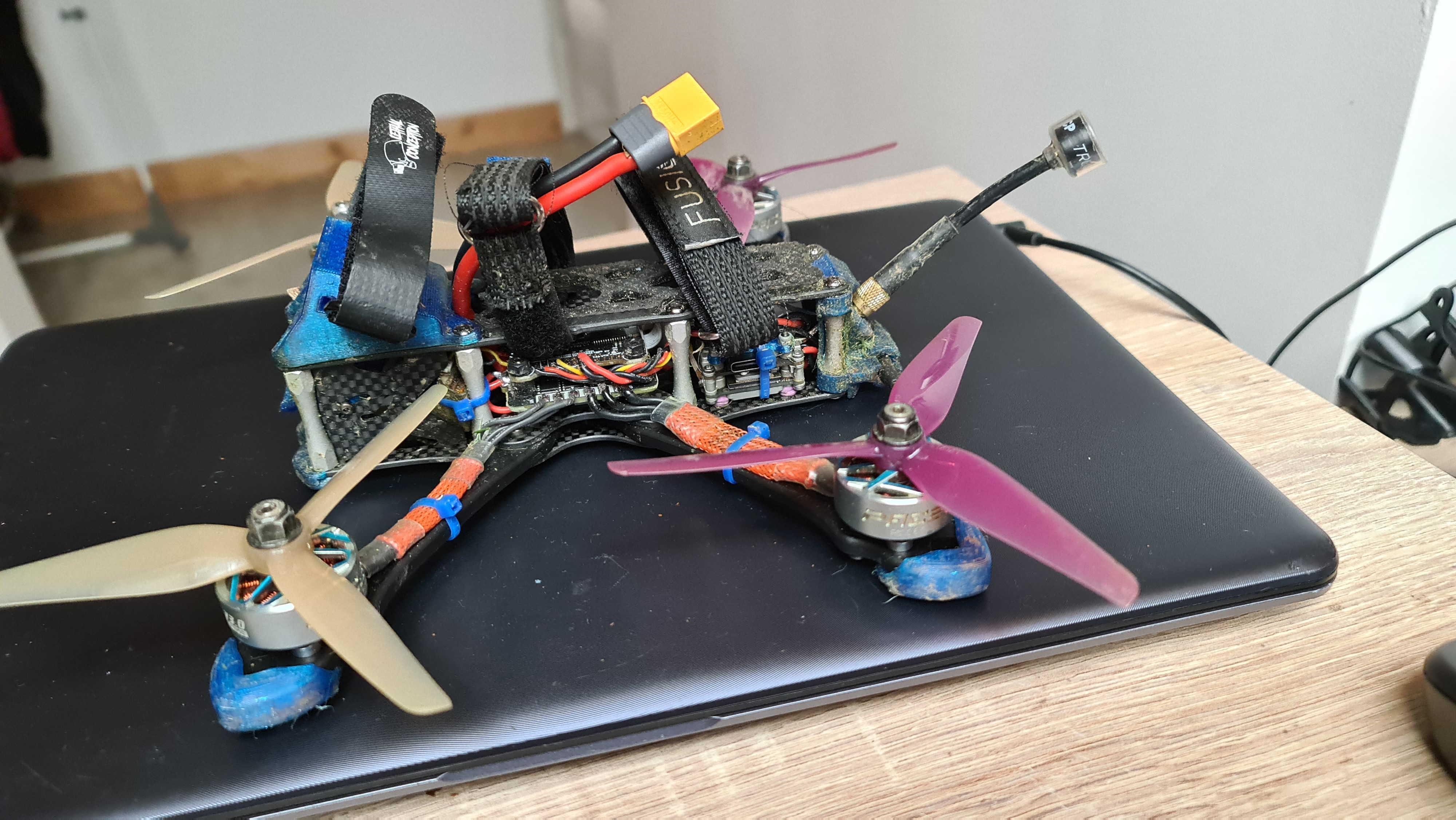 dr greenskin Posté(e) Octobre 23, 2022 Signaler Posté(e) Octobre 23, 2022 Topic Attachments Bon, je vous présente René, le phoenix qui renaît de ses cendres. Pour la petite histoire cette frame a déjà pris feu deux fois via les esc et les fc (je suis mauvais je sais!). Du coup lifting sauce foxeer (au moins ça, ça tiens pour de vrai) et plus de départ de feu, par contre le quad enflamme les cieux! Super feeling en vol, il est très réactif du coup il à déjà pris de sacré chocs pour son inauguration... costaud! J'ai récupéré les moteurs du vega (je le garde pour du bando monté en emax celui là!) pour du pure freestyle et il a du répondant! Par contre pour les mêmes moteurs et hélices montés on notera que le véga, malgré ses bras en 6mm (edit: 5,5mm comme le rené), top et bottom plus épaisses pour un empatement quasi identique est.... plus léger de 14 grammes! Bon c'est pas énorme surtout pour du 5" mais quand je vois le prix divisé par deux pour le vega, avoir du monégasque c'est classe mais ça coûte plus chère...! Bon on dira que les fraises à contourner ont du êtres plus onéreuses pour le fusion, la finition est juste tip top, la rugosité est exemplaire sur les congés c'est la première fois que je constate ça sur un châssis en carbone ( et le véga il est à angle droit d'où son tarif). Seul bémol, pour limiter la longueur des câbles et ne pas les faire passer sur le gyro j'ai monté l'esc avec le xt 60 en devant du quad, soucis: le condo et buzzer ne rentraient pas, obligé de souder les awg 12 à 90° sur les pads, j'espère que ça tiendra dans le temps. Enfin bon le principal étant de s'amuser ce quad va rester dans ma flotte un moment j'espère... je n'ai pas compté le vtx (vista) car il m'a déjà servi pour d'autres build ainsi que le rx csf. Les photos sont un peu mode crado, il s'est déjà pris quelques gamelles dans la terre fraîche, j'ai pas pensé à en faire avant (pi on s'en fout le principal c'est qu'il vole d'abord!) POIDS : 436 grammes Liste des composants Frame fusion F212 105 € FC foxeer F722 v4 70 € ESCs 1 x foxeer reaper F4 65 A 100 € Moteurs 4 x P2207 V3 1950KV - T-Motor 104 € Jeu d'hélices 1 x HQProp ETHIX P3 Peanut 4 € Caméra FPV Caméra Caddx Nebula PRO 720P/120fps HD digital 70 € Émetteur vidéo vista Antenne vTx vista Récepteur radio csf LiPo ce qui traine en 6s 1100 mah Prix total : 453 € 2 2