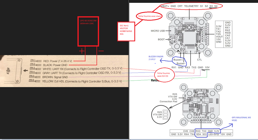 cedricain Posté(e) Décembre 10, 2024 Signaler Posté(e) Décembre 10, 2024 Salut à tous! Je débute dans le FPV et j'aurai souhaité avoir vos remarques sur le montage de mon drone svp. J'ai un doute notamment sur le fait que le DJI O3 et mon GPS soit raccordé tous les deux à RX3/TX3 sur la FC (bien que l'O3 soit raccordé avec la fiche fournie sur le recto de la FC, et le GPS par soudure de chacun des fils et sur le verso).; et que cela pose problème par la suite sur betaflight... Merci par avance à tous.
