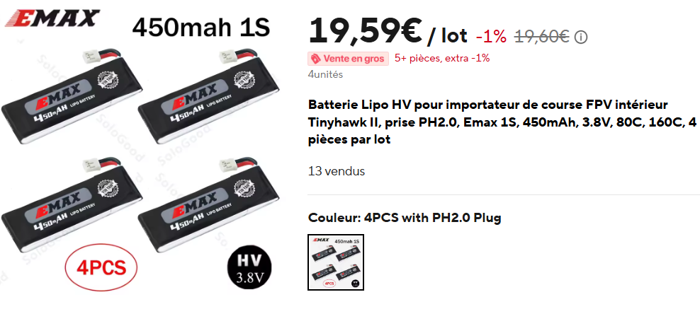 manukatche Posté(e) Avril 8 Signaler Posté(e) Avril 8 Bonjour amis FPVistes Je m'apprête à commander des batteries pour mon petit drone EMAX en 1 S : J'ai besoin d'un chargeur pour 5 batteries au total, pas un truc évolutif, juste pour charger ces petites batteries simultanément, comme ça j'aurai un pack complet à donner à mon petit fils quand je me serai fait la main Par contre, je trouve de tout, des chargeurs très bon marché et des chargeurs sortis tout droit de la NASA Je ne veux pas faire de conneries, j'ai besoin d'un chargeur bon marché mais pas au prix de la sécurité. Quelqu'un veut il bien m'éclairer à ce sujet? Et svp, une personne qui maitrise le sujet, je sais depuis peu qu'il faut faire attention avec ces batteries. J'en profite aussi pour commander un sac ignifugé. Merci d'avance pour vos lumières