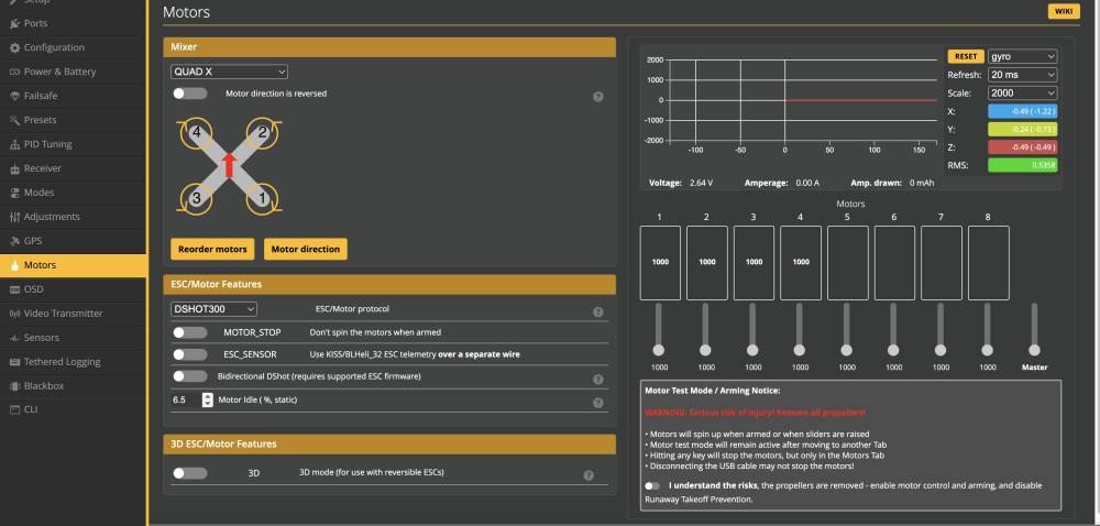 Solution spid99 Posté(e) Avril 15 Solution Signaler Posté(e) Avril 15 (modifié) Il y a 10 heures, yanover a dit : Si j'augmente encore les gaz, il part sur le côté et se retourne Soit les sens des moteurs VS les hélices. Vérifie que le bord d'attaque des hélices correspond bien avec leur sens de rotation (le bord haut des hélices doit tendre vers le sens de rotation) Faire des tests (sans hélices) dans l'onglet "Moteurs" en n'oubliant pas de cocher l'inversion si ils sont inversés : Soit l'attribution de l'ordre des moteurs (mais si tu n'as pas flashé ça m'étonnerais que ce soit ça ^^) Il y a 10 heures, yanover a dit : Est-ce que le grincement d'un des moteurs d'origine doit m'inquiéter ? Oui ce n'est pas normal .. Modifié (le) Avril 15 par spid99 1