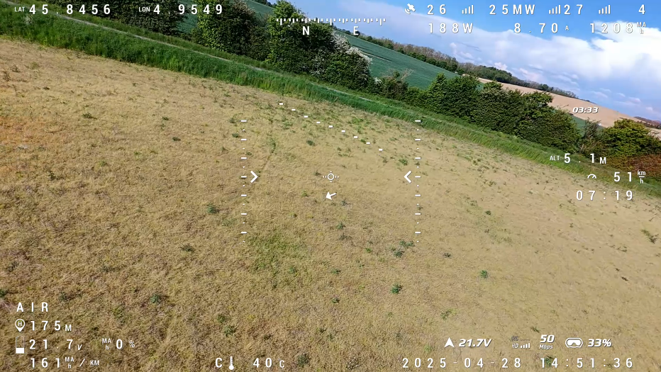 Silverglade Posté(e) Avril 28 Auteur Signaler Posté(e) Avril 28 Hello ! Alors des news ! Cet aprem j'ai fais mon 1er vol après avoir longuement cherché des endroits safe et intéressant autour de chez moi. J'ai retenu 2 spots. Le 1er niquel si ce n'est que c'est à côté d'une grande antenne type téléphonie il me semble, donc je pense que le moment ou j'ai eu une courte perte de signal vidéo c'était à cause de ça ? (elle était entre moi et le drone) Niveau sensation, incroyable ! J'en ai encore de l'adrénaline ! C'est indescriptible hahaha !!! Et il me semble que mon temps de vol est de 7-8min (télémétrie cumulée fin de vol), à vérifier quand j'arriverais à surveiller l'heure Merci à vous et vos ressources de m'avoir permis d'enfin accéder à ce rêve de voler ! J'ai pu tirer 200m sans réels problèmes, au delà j'ai aléatoirement le bas de mes goggles 2 qui devient orange donc je suppose que ça veut dire fait demi tour Par contre je suis allé trop vite encore une fois, batterie dans le mauvais sens (90°), pendant le vol la prise balance est passé dans les hélices et le dernier pin à explosé... J'ai 4 sujets sur "réparation 6s" ouverts, je pense que je devrais trouver une solution, au pire je rachète un kit de fiche sur amazon...(?) J'ai pu constaté également que les champs labourés, c'est vraiment pas top, un coup il fait la tondeuse, un coup il mange la terre ! Ce qui m'a fait penser sur place que j'ai oublié un élément important dans tout ce setup : le tapis de décollage qui m'aurait énormément été utile cet aprem ! Mais là je suis en train de me dire, un tapis souple de toute façon même sur un relief de merde ça ira pas J'ai eu mon premier crash à cause, de souvenir, une tentative d'approche nerveuse pendant une alerte low battery. J'ai du forcer sur les moteurs en paniquant et "kaboum" ? 2e spot, encore mieux que le premier niveau interaction avec la nature (quelques arbres, haies) Je m’essaie à l'enregistrement, je test le mode rescue, le bouton panique (mode angle), je verifie tout l'osd, j’essaie mes premières pirouettes, moment incroyable haha On a l'impression que si on se trompe on va mourir Pas d'antenne pas de soucis de signal sauf si je passe loin derrière des arbres, et je pense que c'est ce qui a terminé ma session. J'arrivais à 21V, donc je me dis un demi tour au dessus d'une haie en passant derrière et retour maison. Ben ça s'est arrêté à "en passant derrière" Perte vidéo, perte de signal, j'ai rien compris. Visiblement les haies faut éviter ! J'étais en 25mw elrs et 50 en video (par defaut) mais je crois que je dois descendre aussi légalement? J'ai à ce moment là fortement apprécié toutes mes recherches avant la conception du drone, ce qui m'a poussé à acheter un buzzer autonome sans lequel je serais clairement encore en train de le chercher ! Je le retrouve et surprise, un écrou à disparu, sûrement enfoncé dans la terre et l'hélice complètement défoncée sur son axe mais toujours sur le moteur. Qu'est ce qui a pu se passer, pour la perte totale de signal pour commencer ? Et pour que l'hélice termine comme ça ? En perte totale normalement le failsafe soit se mettre en route non ? AH... en écrivant je me rappel que mon failsafe est en mode RTH pas en mode crash... aie... Mais du coup le mode bindé "GPS rescue" à rien à voir avec le RTH du failsafe ? Je peux avoir un failsafe "crash" et un rescue RTH en meme temps ? J'en profite pour demander aussi si il y a des choses ou astuce pour le nettoyage ? J'ai pu constater que le mode tondeuse est efficace... ben voilà. Me dites pas qu'il faut y'aller à la pince à épiler pour l’électronique (FC ESC, vtx...) J'ai recup l'image quelques secondes avant le crash si ça peut vous indiquer quelque chose ? x) En haut à droite le RSNR à 4 c'est pas ouf non ? Dans l'ordre, gps verrouillés, lien tx, RSSI, RSNR