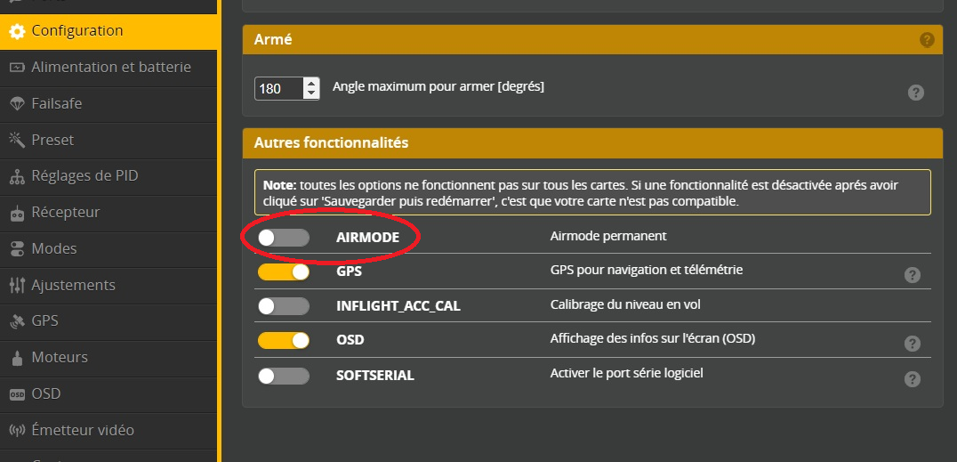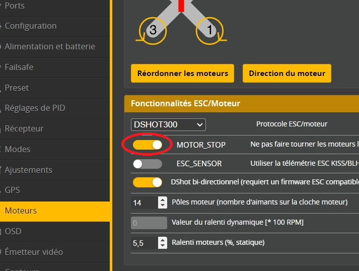 spid99 Posté(e) Mai 4 Signaler Posté(e) Mai 4 (modifié) Salut jeune homme, Deux raison pour lesquels les moteurs tournent au ralentie à l'armement : "Motors Stop" si il est coché les moteurs ne tourneront plus à l'armement. Si et seulement si "Air mode permanent" est décoché. Il est donc normal que par défaut les moteurs tournent au ralentie lors de l'armement. Il est conseillé de laisser ces paramètres par défaut. Perso (il n'y a que moi ou presque, qui fait ça) je coche "Motors stop" et décoche "Air mode permanent" pour le mettre sur un auxiliaire (dans modes) ce qui me permet de le déclencher ou enlever manuellement, décollages et atterrissages (il est indispensable en vol) Le "Motors stop" désactivé ne change rien pour moi, il est quand même conseillé de ne pas cocher ce paramètre et mettre un "Pré Arme" par sécurité sur un Aux (Onglet "Modes"). Modifié (le) Mai 4 par spid99