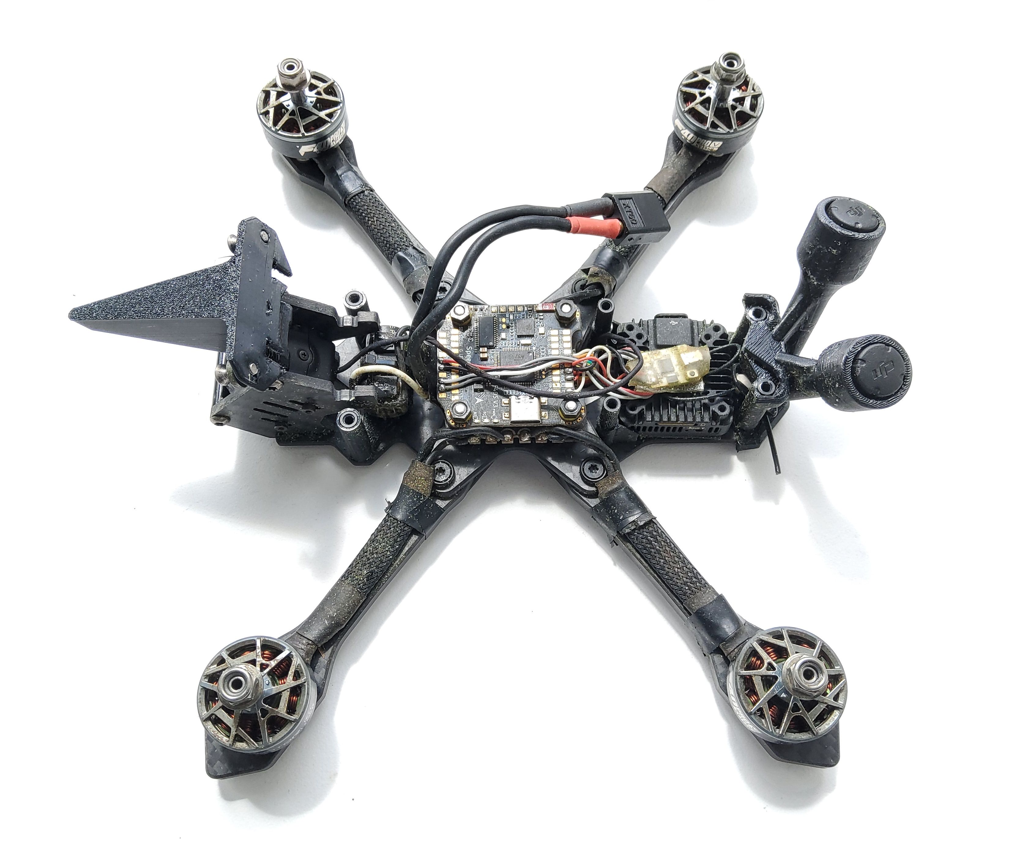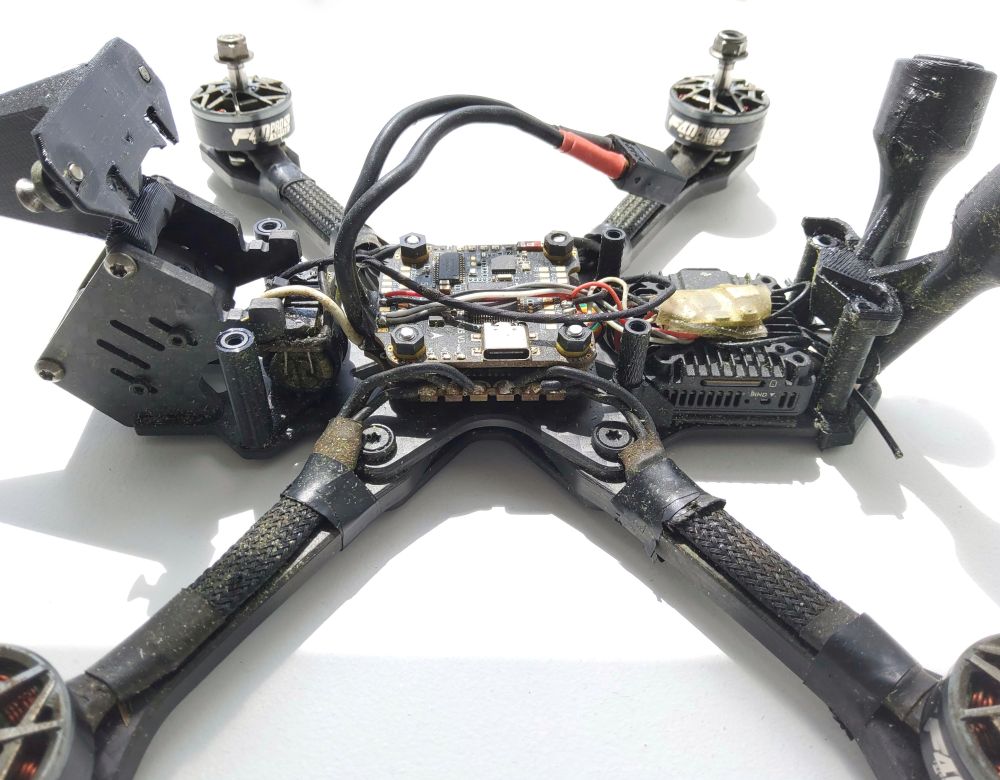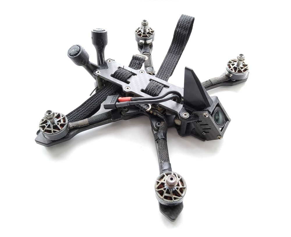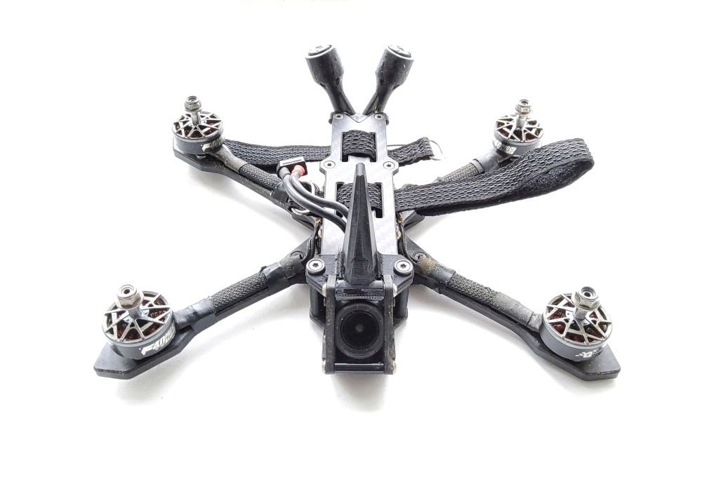 nochamo Posté(e) Mai 7 Signaler Posté(e) Mai 7 Topic Attachments il était temps d’upgrader mon build principal.... en O4PROo..... tant qu’a découper des cam plates... bah autant faire découper une frame...... ma version lowprofil (20mm) de mon jeno m’avait laissé sur un sentiment mitigé.... le remplacement des fc , la bidouille pour caser le condo s’est avéré un peu reloud. donc je tente une version intermédiaire avec des entretoises en 25mm (pile a mi chemin du jeno classique et de mon low profil)..... Avec ma stack speedybee sans shield, ca passe..... suffit juste de recouper les gummy entre la fc et l’esc...... le build en lui meme est ultra classique, et comme il est transplanté (sauf le O4), pas de surprise.... pour la frame, je profite du petit gain de poids en entretoises, taille de bus pour: mettre une bottom de 3mm (dont j’ai viré les trous pour vtx) top plate de 2,5mm bras bando ca fini a 140gr de frame, donc tout a fait acceptable au vu de la solidité du bordel...... c’est pas encore un KayouDur, mais ca devrait tenir dans le temps..... niveau BB, c’est un tout petit peu plus propre qu’un jeno classique. et cerise sur le gâteau, le preset de jéjé passe crème (je n’ai absolument pas touché a la conf) voila donc mon jouet qui devra tenir jusqu’a la sortie du O5 ..... bon je doute que la stack tienne jusque là, elle a deja un beau passif derrière elle ...... mais j’espère que le reste tiendra. Les photos du build monté, ont été faite post maiden.... et on peu voir qu’il a deja pris du tronc d’arbre pleine face dans les cam plate ...... les doigts dans l'nez...... niveau feeling pur, je ne peux pas vraiment dire que je sent une grosse différence (presque certain que je ne sait pas faire la diff en test a l'aveugle), mais je suis encore plus serein sur la solidité (épaisseur des plates et bras bando)....... et vu qu'il embarque un O4PRO, j'aime autant.... POIDS : 420 grammes Liste des composants Frame JeNo 5.1 low profil 80 € FC speedybee F405 V3 ESCs 1 x speedybee 50A Moteurs 4 x F40 1950 kv Jeu d'hélices 1 x Ethix P35 Caméra FPV DJI O4 PRO 250 € Émetteur vidéo DJI O4 PRO Antenne vTx DJI O4 PRO Récepteur radio Ghost LiPo ovonic 1200 ou 1400 mah Prix total : 330 € 3 1 4