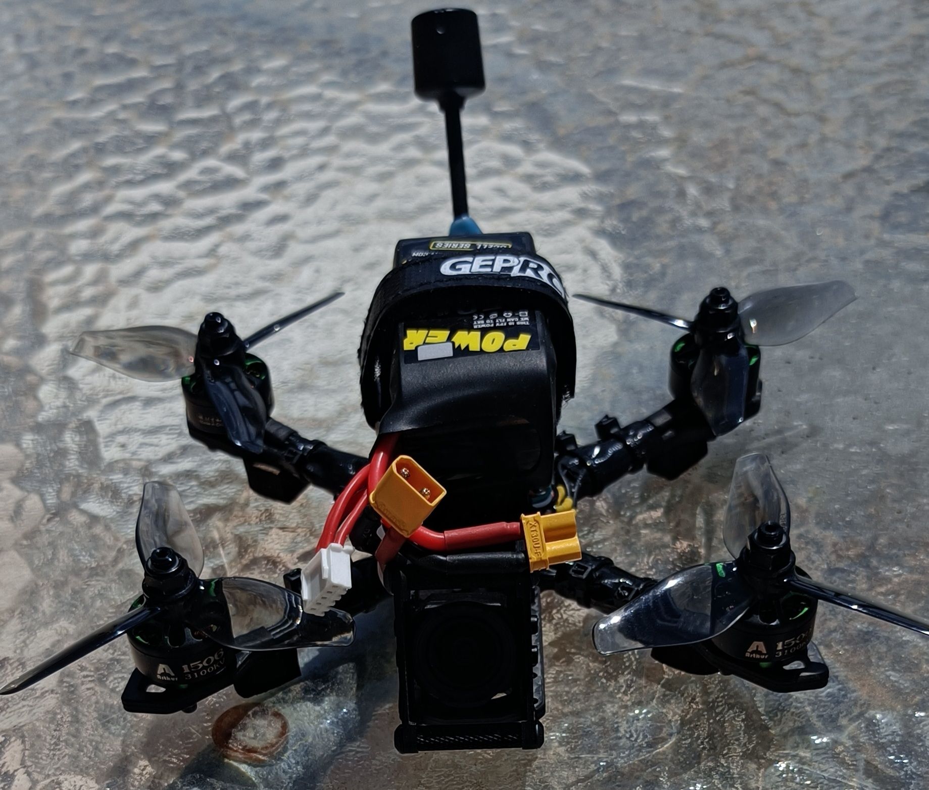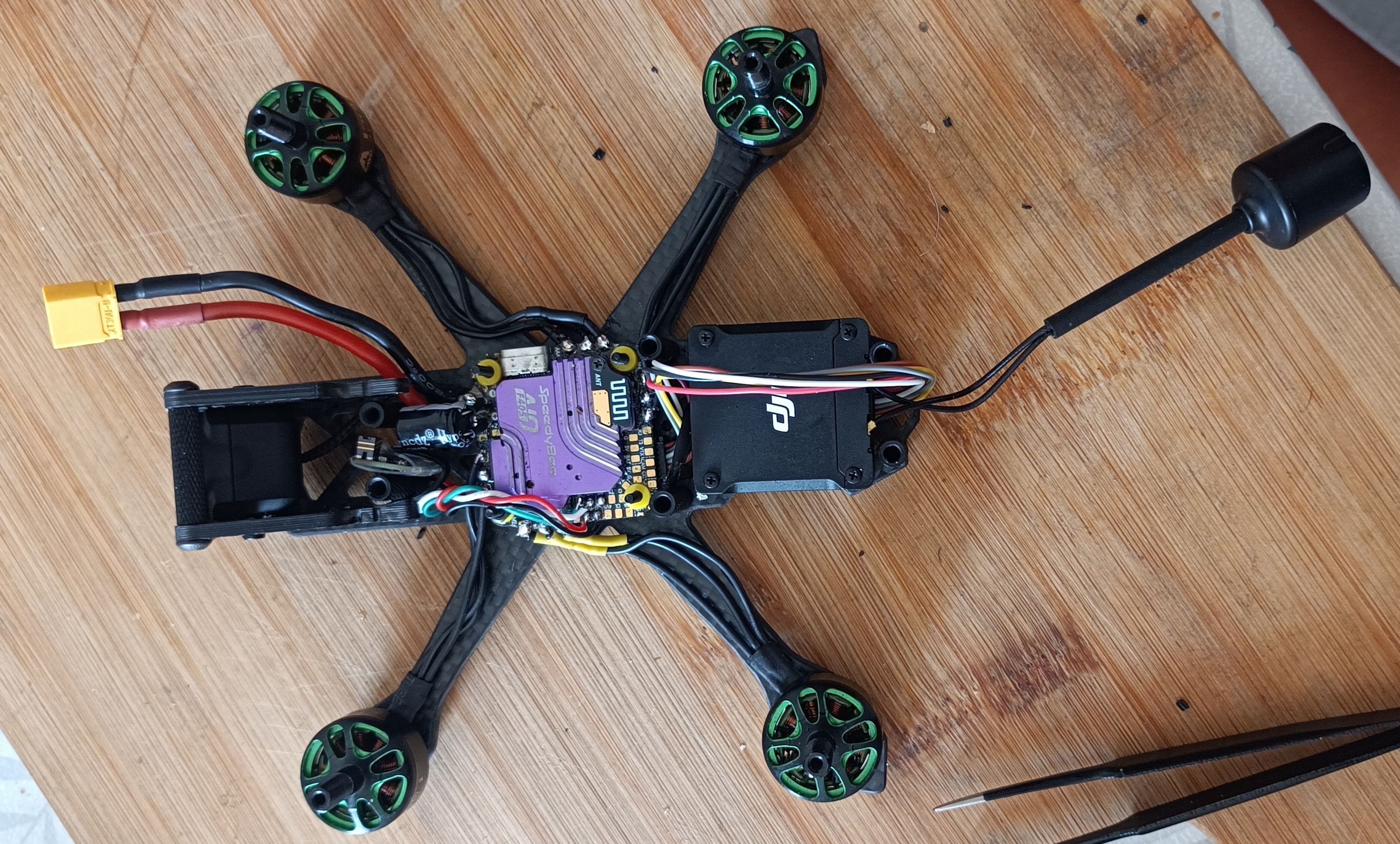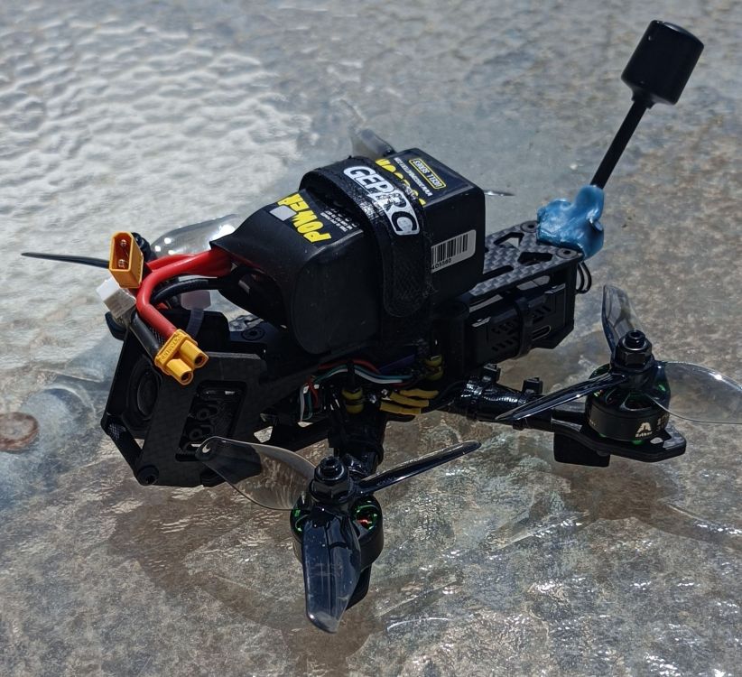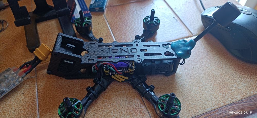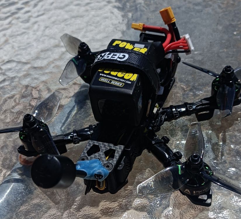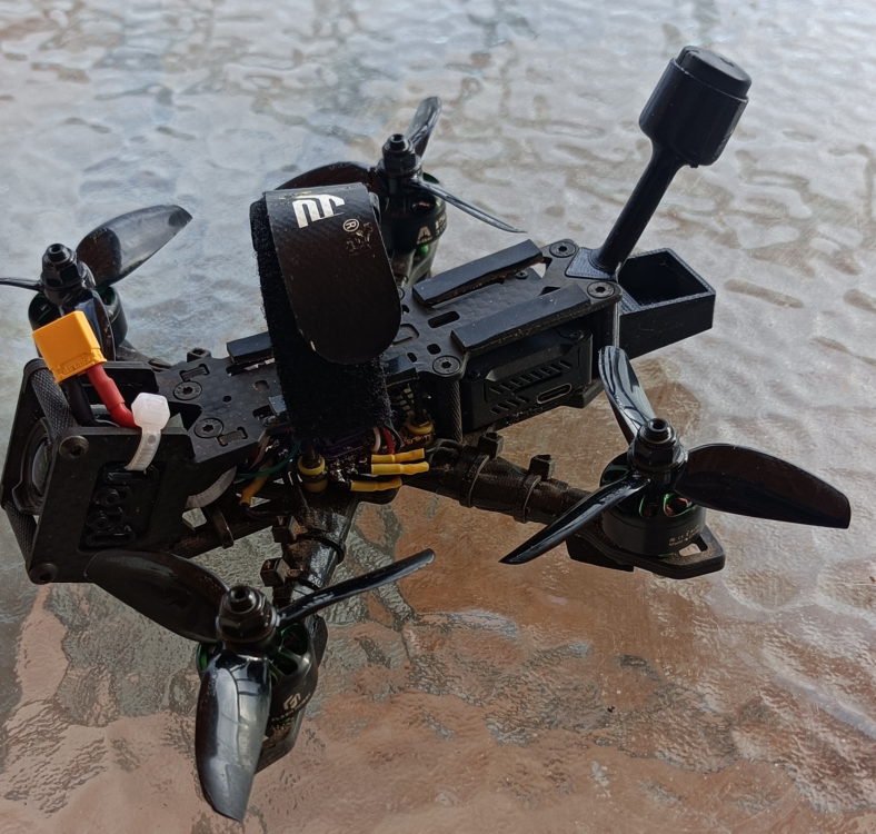 spid99 Posté(e) Mai 11 Signaler Posté(e) Mai 11 (modifié) Topic Attachments Avec une année de retard, j'étais parti sur un O4 lite, mais je me suis planté en prenant la Frame, du coup j'avais un O3 en rab .. Un peut lourd du coup, pas grave ça ira bien pour la balade, j'attends un FIT pour mettre le O4 Lite. Un grand merci à @nochamo pour son aide ! Pas beaucoup de photos du montage, en plus j'ai due composer avec les moyens du bord et adapter le support d'antenne avec du chewing-gum (plastique thermo formable) @nochamo tu valide ? : Remplacement du "chewing-gum" par un support TPU Antenne et GPS POIDS : 215 grammes Liste des composants Frame Jeno 3" 44 € FC SpeedyBee F405 AIO 40A 63 € ESCs 1 x AIO Moteurs 4 x 1506 3100kv (récupe) Jeu d'hélices 1 x 3" 2 € Caméra FPV DJI O3 Air Unit 199 € Récepteur radio Nano ExpressLRS 2.4G XR2 11 € LiPo Lipo 4S 850mAh 150C - Série UCELL - Dogcom 16 € Prix total : 335 € Modifié (le) Juin 18 par spid99 1 1