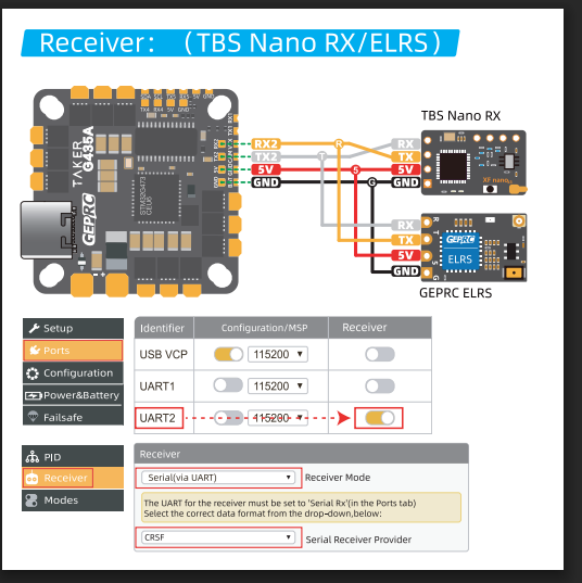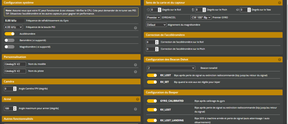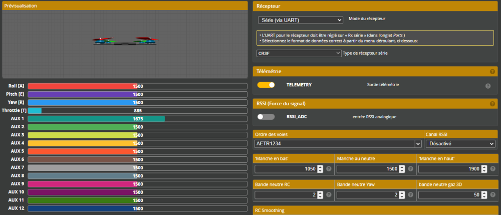 Perceval Posté(e) Mai 11 Signaler Posté(e) Mai 11 Bonjour à tous, je débute dans la discipline et j ai un petit problème: J'ai un cinelog 25v2 et après un crash j'ai du changer le contrôleur de vol " GEPRC GEP-TAKER G4 35A AIO 2-4S BLs ". mais quand je bouge les sticks rien ne se produit. Mon matériel : -GEPRC GEP-TAKER G4 35A AIO 2-4S BLs -radiomaster pocket Je précise : -j'ai flashé mon récepteur et ma radio en ELRS -j'ai flashé ma FC -mon onglet port sur BF est bien paramétré -les soudures sont bonnes -j'alimente mon quad avec une lipo quand je fais mes tests -quand je bouge mon drone je le vois bouger dans l'onglet installation de BF -mon vtx fonctionne et les moteurs aussi dans BF