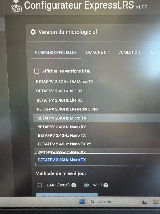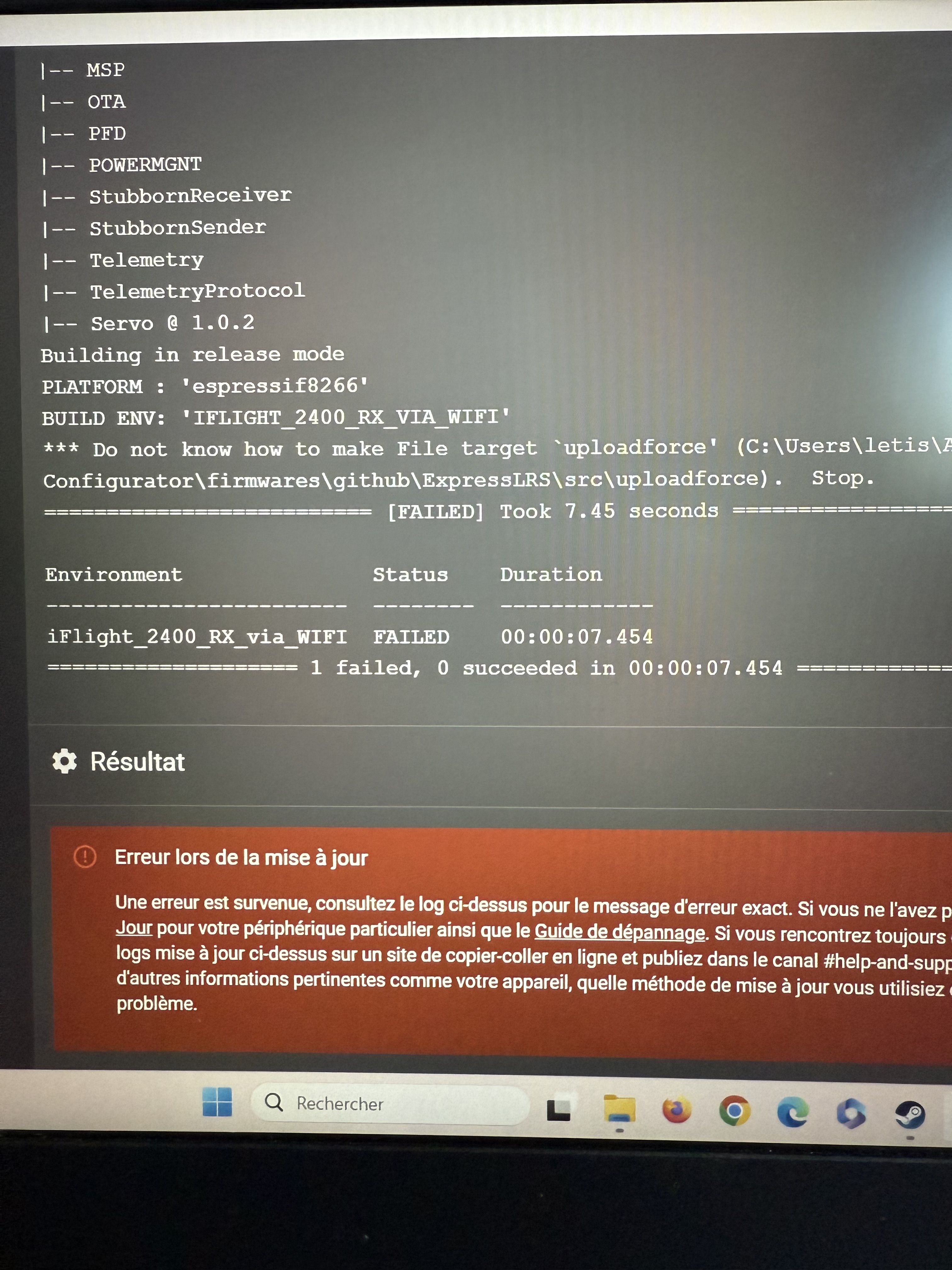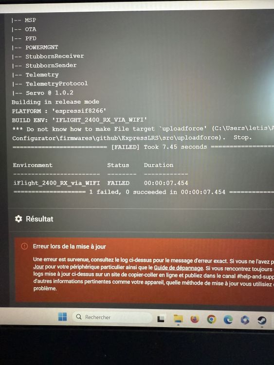 Sebooney Posté(e) Mai 15 Auteur Signaler Posté(e) Mai 15 Le problème c’est que je n’arrive plus a faire la mise à jour du TX ( le RX est bien en LBT avec la dernière maj) ExpressLRS configurator reconnais bien mon module et sélectionne automatiquement la version mais quand je fais la maj, j’ai un message d’erreur Pourtant j’ai la version 1W