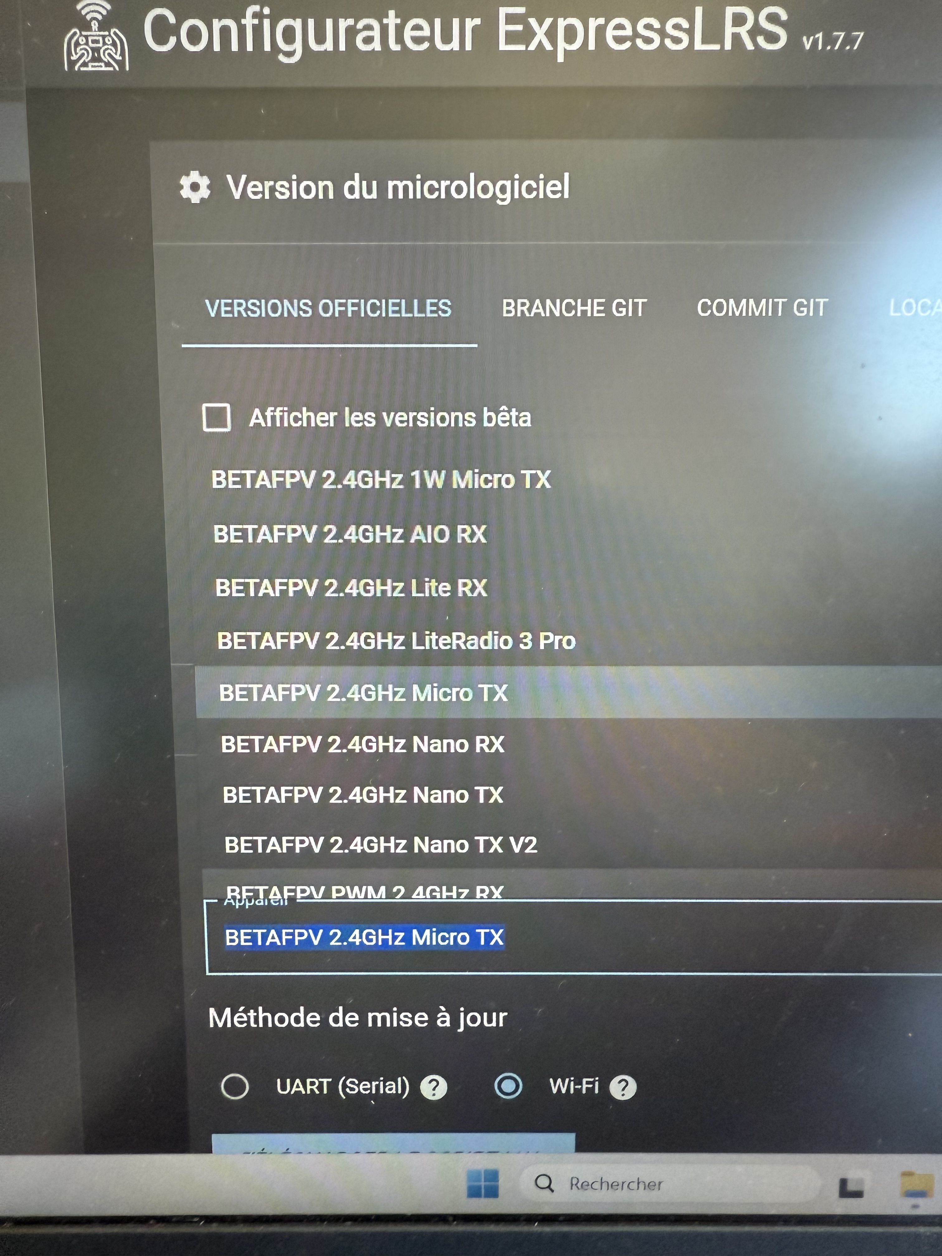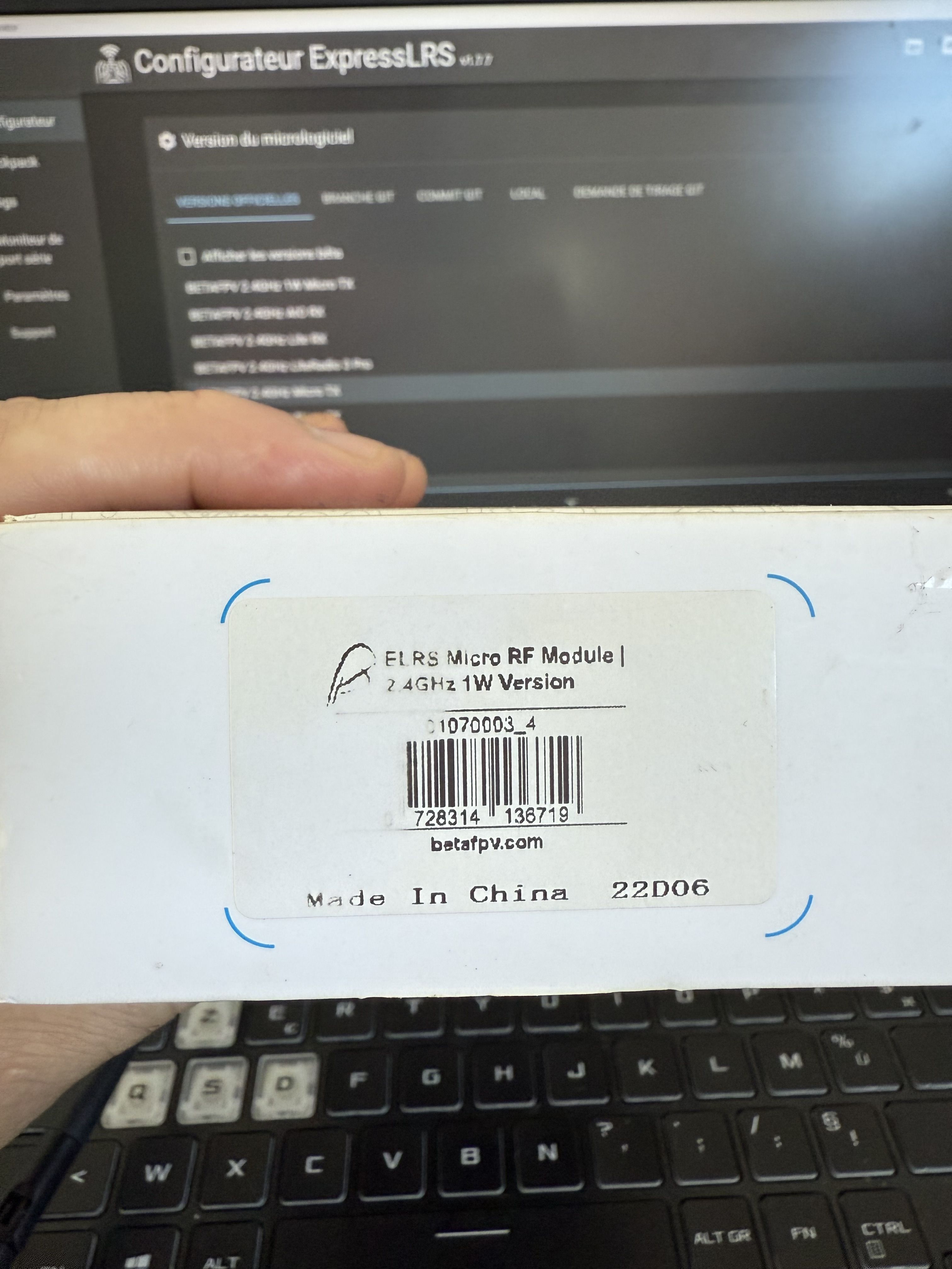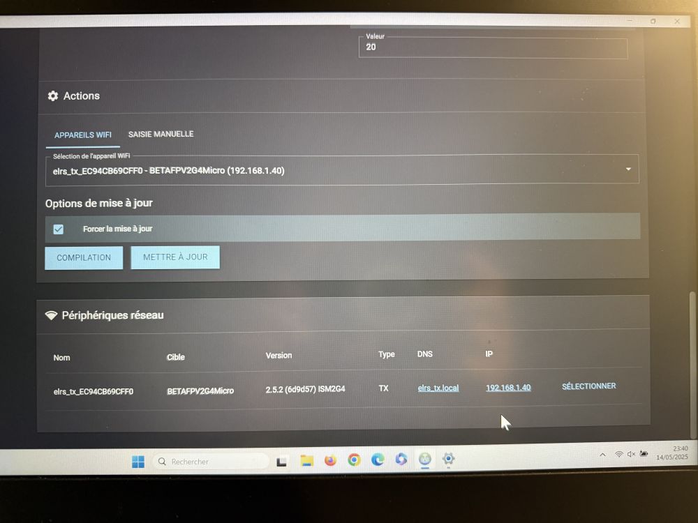 Sebooney Posté(e) Mai 14 Auteur Signaler Posté(e) Mai 14 Bon, j’ai réussi avec flasher le RX avec la dernière maj mais impossible de le faire pour le TX, le wifi est activé sur le module mais rien n’apparaît sur le réseau Le TX est bien reconnu dans ExpressLRS Configurator mais pas visible sur mon réseau