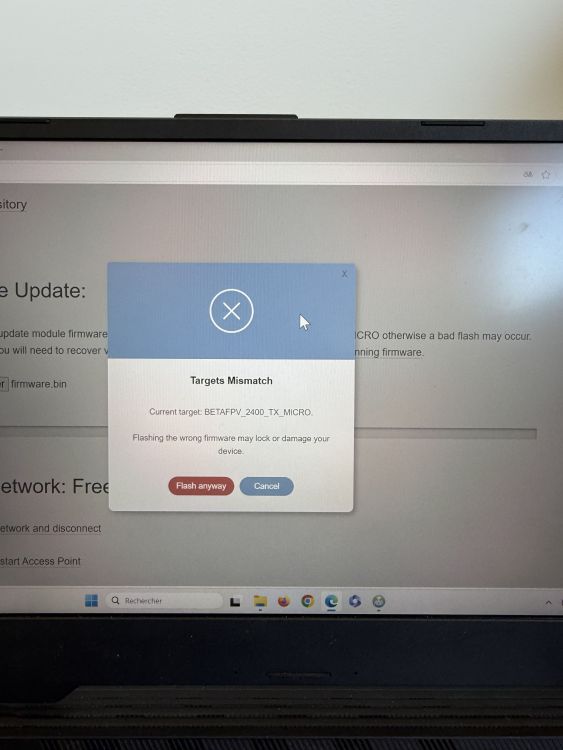 Silverglade Posté(e) Mai 15 Signaler Posté(e) Mai 15 (modifié) Je doute que ça change grand chose pour la maj ^^' L'erreur que t'as c'est un mauvais firmware sélectionné, comme si tu voulais mettre du betafpv dans un radiomaster par exemple. Est ce que ta radio de base est à jour déjà ? Il y a peut-être un prob de communication entre la radio et le module avec tout ce que t'as bidouillé De souvenir tu peux aussi mettre a jour un module en passant par l'usb de la radio Modifié (le) Mai 15 par Silverglade