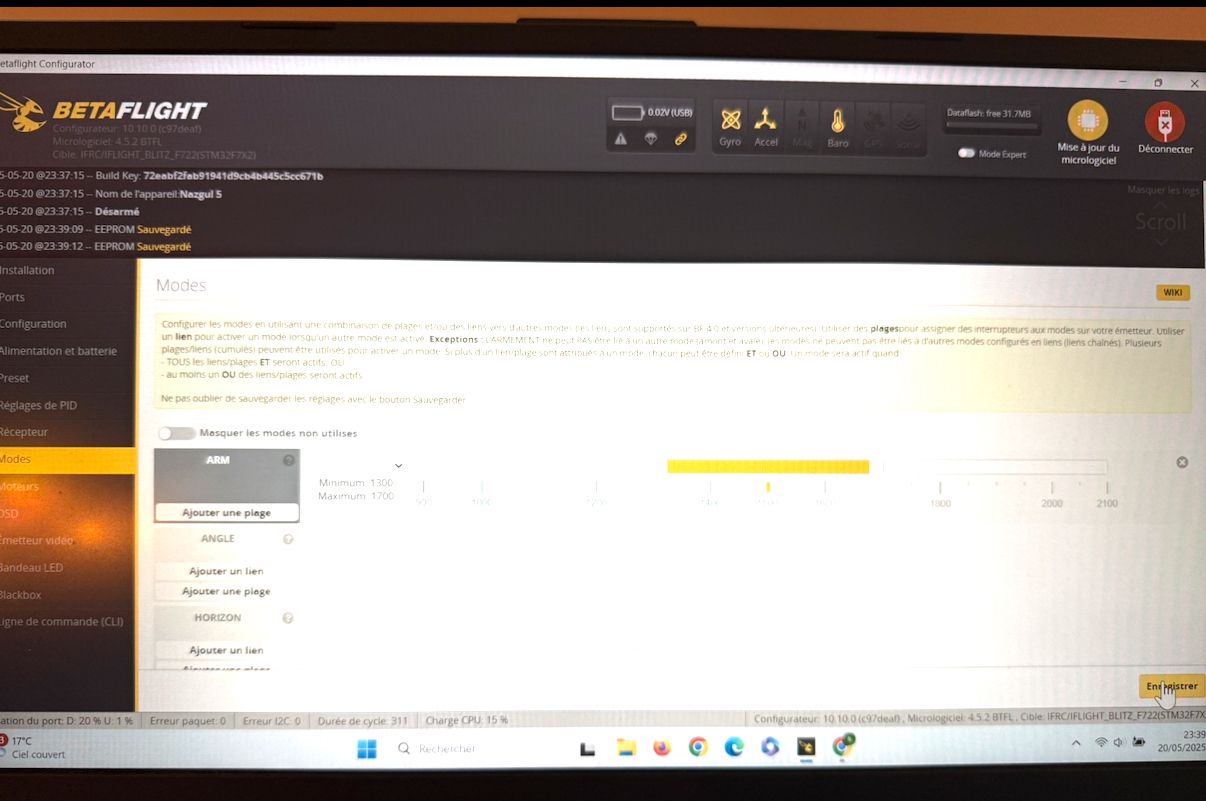 Sebooney Posté(e) Mai 20 Auteur Signaler Posté(e) Mai 20 Bonsoir, alléluia bind réussi, ENFIN !! La radio est bien reconnue dans betaflight et ma TX16s me dit « Telemetrie retrouvée » seulement les moteurs ne tournent pas . Je ne sais pas si les uart sont bien paramétrer. J’ai essayé de mettre le mode ARM mais le throttle n’est pas détecté. merci d’avance pour vos retours