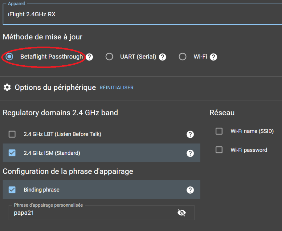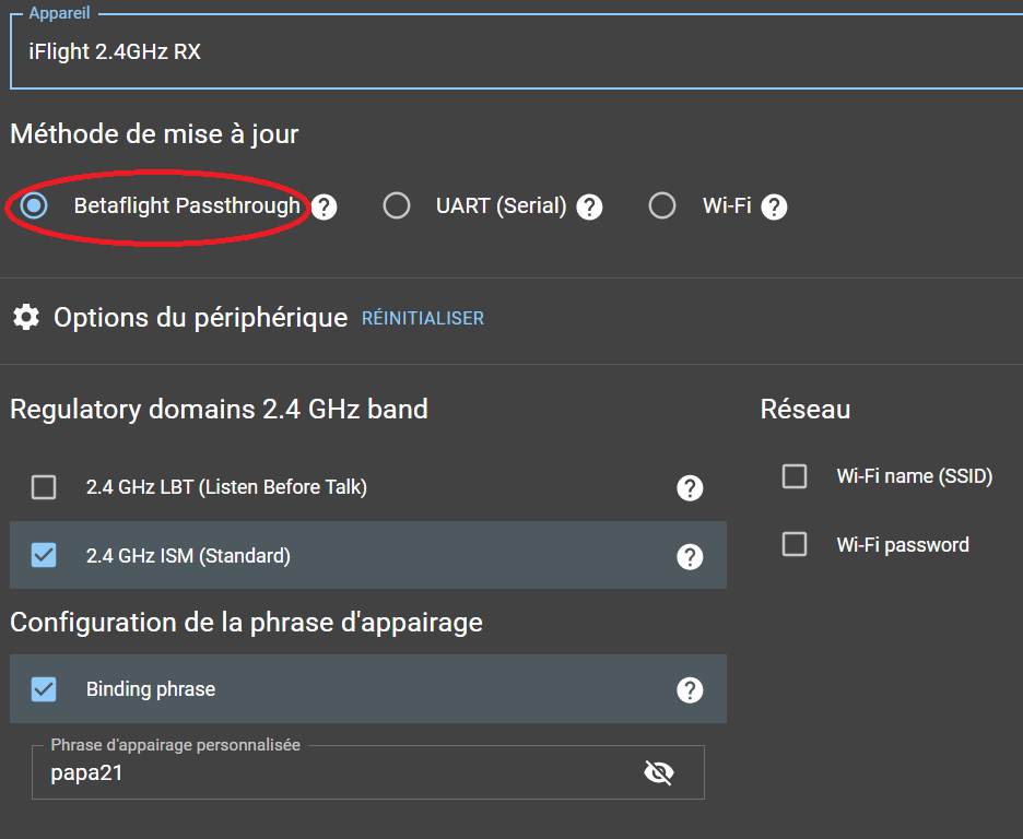 spid99 Posté(e) Mai 13 Signaler Posté(e) Mai 13 (modifié) SAlut, j'ai jamais réussi en Wifi .. Essaie en "Betaflight Passtrhough" en branchant ton PC en USB sur ta carte de vol, il faut parfois l'alimenter (refroidis tout ça avec un ventilo si besoin). En mettant la même "Binding Phrase" que sur le TX. Et ne pas oublier de travailler sans hélices sur un drone alimenté Modifié (le) Mai 13 par spid99