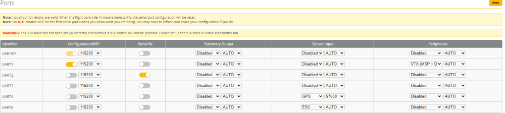 Nebra Posté(e) Mai 13 Signaler Posté(e) Mai 13 Bonjour à tous, Je viens de recevoir mon GEPRC Vapor X5, en crossfire o4 pro et avec GPS. A la réception, je m'étonnes un peu de la petite antenne (j'ai toujours vu des drones en crossfire avec des antennes immenses) et je décide de connecter le drone à Betaflight pour aller jeter un coup d'œil côté receiver. Au final je branche le drone et je remarque tout de suite que l'icone GPS en haut à droit est éteint: Au final c'est ma faute, je vois que lorsqu'il a été emballé, le GPS a été rabattu dessous et débranché. Je disconnect de betaflight, je débranche le drone, je branche le GPS et je refais la procédure dans l'ordre inverse mais toujours rien. Ayant déjà des soucis de GPS un peu aléatoire sur mon autre drone (DarwinFPV CineApe35) j'avais déjà lu que l'accroche aux satellites peut prendre du temps surtout la première fois, donc je laisse le drone branché mais après plus de 10 minutes toujours rien. Côté ports j'ai bien le GPS affiché, UART4 ça a l'air de coller à la doc du drone (mais je suis pas certain de bien la lire étant plutôt débutant), sur la doc du GPS (GEP-M10) en chinois je vois plusieurs fois 115200 donc je remplace 57600 par cette valeur, save and reboot, je laisse de nouveau 10 min pour lui laisser le temps d'avoir une accroche, mais toujours rien. Dans l'onglet configuration, le GPS est bien activé et lorsque je vais dans le CLI faire "status" j'ai la sortie suivante: Entering CLI Mode, type 'exit' to return, or 'help' # # Building AutoComplete Cache ... Done! # # status MCU F722 Clock=216MHz, Vref=3.31V, Core temp=46degC Stack size: 2048, Stack address: 0x20010000 Configuration: CONFIGURED, size: 3800, max available: 16384 Devices detected: SPI:1, I2C:1 Gyros detected: gyro 1 locked dma GYRO=ICM42688P, ACC=ICM42688P, BARO=DPS310 OSD: MSP (53 x 20) BUILD KEY: 9e0b107c4a5696cc1e9376491ce1d000 (4.5.1) System Uptime: 475 seconds, Current Time: 2025-05-13T17:44:24.696+00:00 CPU:26%, cycle time: 123, GYRO rate: 8130, RX rate: 15, System rate: 9 Voltage: 1 * 0.01V (0S battery - NOT PRESENT) I2C Errors: 0 FLASH: JEDEC ID=0x00ef4018 16M GPS: NOT CONNECTED, UART4 38400 (set to 57600), NOT CONFIGURED, version = unknown Arming disable flags: RXLOSS CLI MSP DSHOT_TELEM Donc il ne semble pas détecter le GPS. Je démonte le drone pour vérifier le branchement et ça semble correspondre à la doc du drone et du GPS (mais encore une fois je suis un newbie donc c'est à prendre avec des pincettes). J'ai également tenté de sortir le GPS de son TPU pour voir si des leds s'allument lors du branchement du drone en USB mais rien. Faut-il l'alimenter avec une LIPO, même si ce n'est pas le cas sur mon autre drone? Je n'ai pas encore reçu le module crossfire pour ma Boxer, donc j'avoue avoir un peu peur d'alimenter le drone non bindé (même si les hélices ne sont pas montées). Merci d'avance pour votre aide.