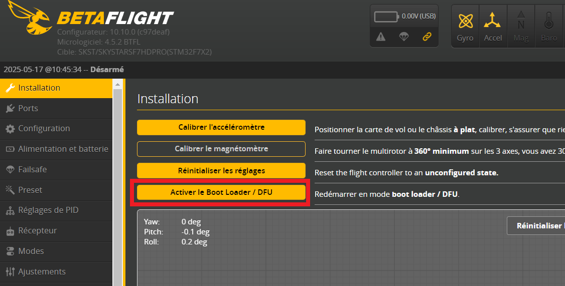 Motard Geek Posté(e) Mai 14 Signaler Posté(e) Mai 14 Non rien à voir, tu utilises un configurateur en version 10.10.0 prévu pour Betaflight 4.5 alors que tu es en 4.0 (qui demande un configurateur en 10.5).