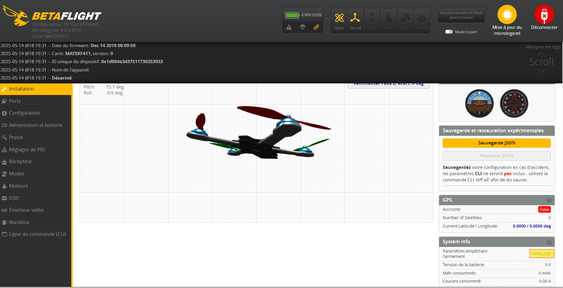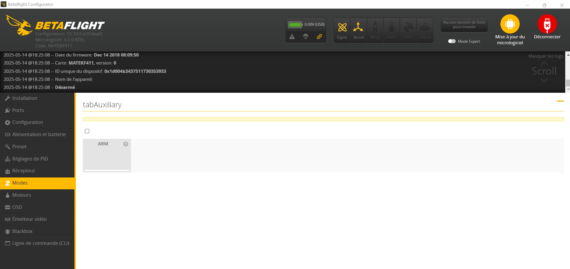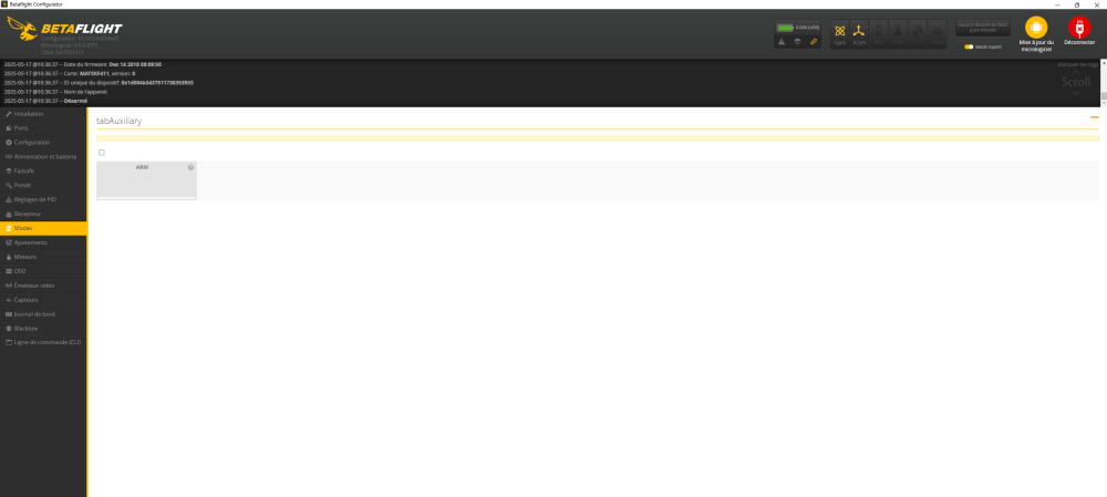 kil241 Posté(e) Mai 14 Signaler Posté(e) Mai 14 Bonsoir, Je viens de recevoir un BETA75 pro en 2s comme sur la photo ci-dessous. Équipé d'une fc MATEKF411 ainsi que d'un système Crossfire. Ce n'est pas mon premier drone, j'ai déjà un 5" qui lui n'a aucun souci. Mais avec le BETA75 ce n'est pas la même chose. Déjà quand je le connecte sur betaflight, il me marque dans l'onglet "Installation", et dans le "Paramètres empêchant l'armement "PARALYSE". Ne connaissant pas cette cause je pars me renseigner sur internet et il est écrit qu'il faut brancher et débrancher les lipos ( c'est un 2s mais avec deux lipos 1s ) . fais donc ça je débranche tout et plusieurs fois mais rien n'y fait , le PARALYSE revient toujours . Il est bien connecté avec la radio tout se passe bien sur l'onglet "Récepteur" dans Betaflight jusqu'à ce que je veuille régler le bouton d'armement... Donc je me dis que ce n'est pas bien grave et vais donc dans l'onglet qui me tient tant à cœur , l'onglet " Modes " , pour enfin pouvoir armer mon drone et faire mes premiers vols en intérieur . Mais là c'est le drame , je clique sur l'onglet . J'arrive donc sur cette page mais bizarre ce n'est pas comme sur le 5"... Je ne peux donc pas régler mon bouton d'armement et je ne peux pas non plus sortir de cet onglet "Modes" sans déconnecter et reconnecter le drone. Est-ce que vous auriez des pistes d'aides pour moi s'il vous plaît ? Bonne soirée. A bientôt