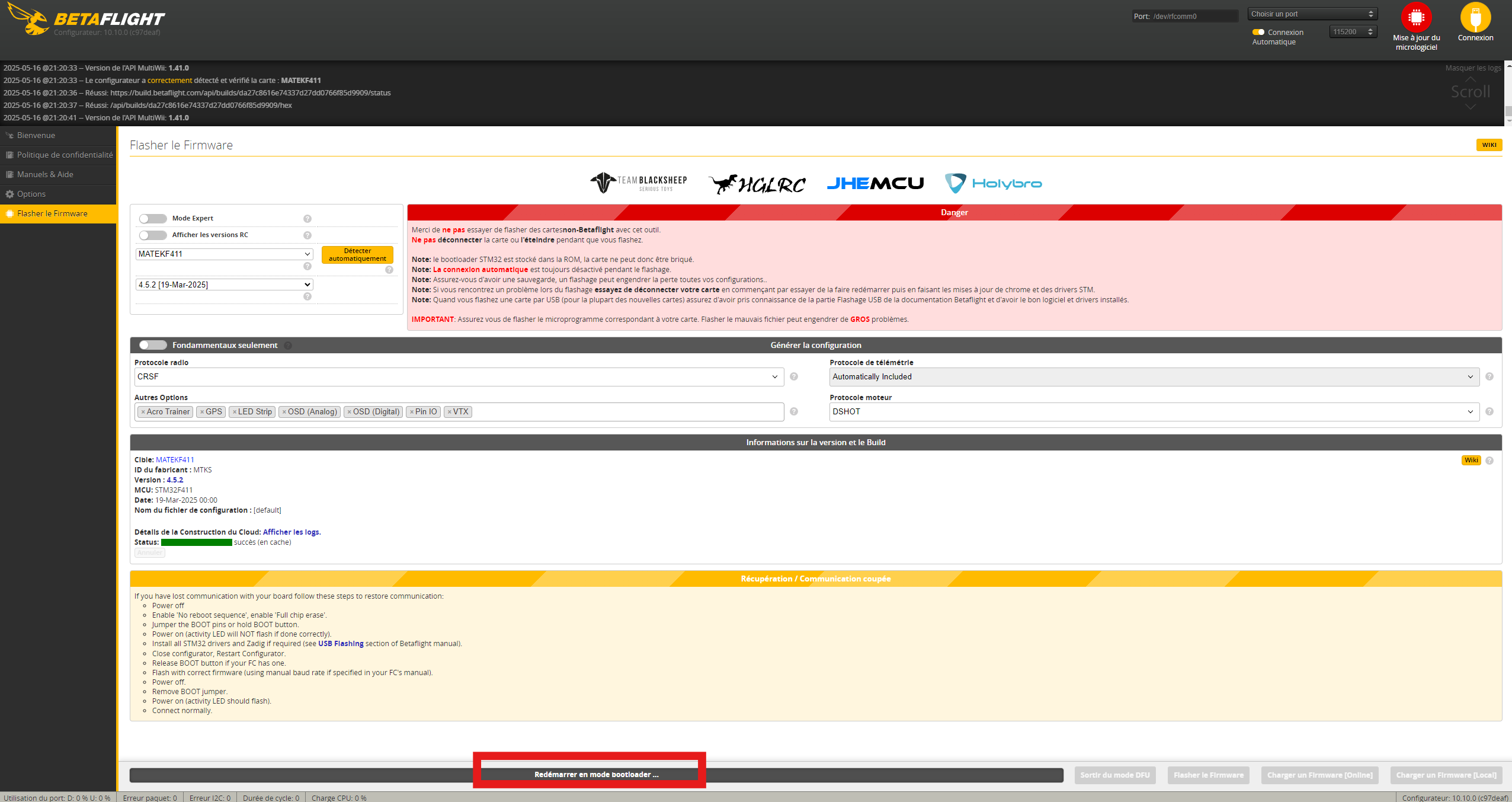 Motard Geek Posté(e) Mai 16 Signaler Posté(e) Mai 16 Visiblement le flash semble s'est bien déroulé, t'as redémarré la carte électriquement j'imagine ? Sinon mauvaise target ? J'ai pas souvenir d'avoir jamais vu une FC Matek chez BetaFPV