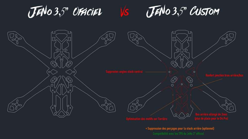 ArnoTlse Posté(e) Mai 20 Signaler Posté(e) Mai 20 Bonjour, Superbe machine. La famille JeNo est en constante évolution . Le choix du 3.5" pour du mid range/ciné, c'est lié au bras de levier et à la surface soufflée plus grande par rapport à un Jeno 3"? Il y a 17 heures, Jerome a dit : Correction des TPU de cam plate à point fixe pour la caméra du O4 Pro Avec les TPU de la page officielle, ceux compatible O3 et O4 avec les onglets, vous aviez du jello avec le O4 pro ? Et le fait de repasser en trou fixe améliorerait ce point c'est ça ? Je pose la question car sur mon jeno 3 light, j'ai effectivement remarqué un peu de Jello avec le o4 pro et les softmount Compatible O4 et O3 de la page officielle et je me demandais si ça venait de là. Du coup, j'en ai refait en augmentant l'epaisseur de l'epaulement pour les vis car avec les originales, le serrage des vis déforment les onglets. Je ne les ai pas encore testé en vol. 1
