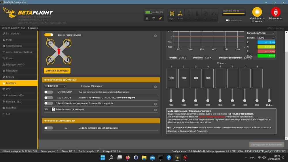 Attafr Posté(e) Mai 25 Signaler Posté(e) Mai 25 il y a 35 minutes, MadriX a dit : ce ci dit pour mon problème Alors stp SANS HÉLICES 1) Tu as calibré l’accéléromètre ? 2) ton drone bouge t’il correctement dans la fenêtre idoine 3) l’ordre des moteurs est t’il correcte 1,2,3,4 4) tes moteurs tournent t’ils dans le bon sens propin ou propout ? (onglet moteur) enfin comme tu l’empêches de décoller, avec le AIRMODE il va faire n’importe quoi, c’est normal ! Une fois tout ces points contrôlés, tu peux monter tes hélices en fonction du sens définis au point 4.