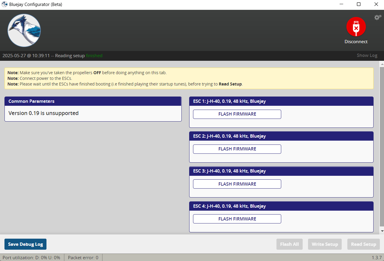 spid99 Posté(e) Mai 27 Signaler Posté(e) Mai 27 (modifié) EDIT : J'ai trouvé la solution, fallait passer par https://esc-configurator.com/ SAlut, je rencontre avec cette carte de nombreux problèmes (USB défaillant, carte qui ne reconnait plus la partie FC) Mais là j'ai un nouveau problème (la carte est neuve !) J'ai modifier le mappage des moteurs avec Bétaflight : No soucis ! Impossible de changer les sens des moteurs, ni avec Bétaflight, ni avec bluejay qui me pond un truc (truk pour la tribu Bordelaise) : J'aimerais bien avoir l'explication ? Car du coup je n'ai accès à rien ! Pour le coup je suis revenu à la méthode ancienne et brutale : inversion du câblage ! Modifié (le) Mai 27 par spid99 Orto 2