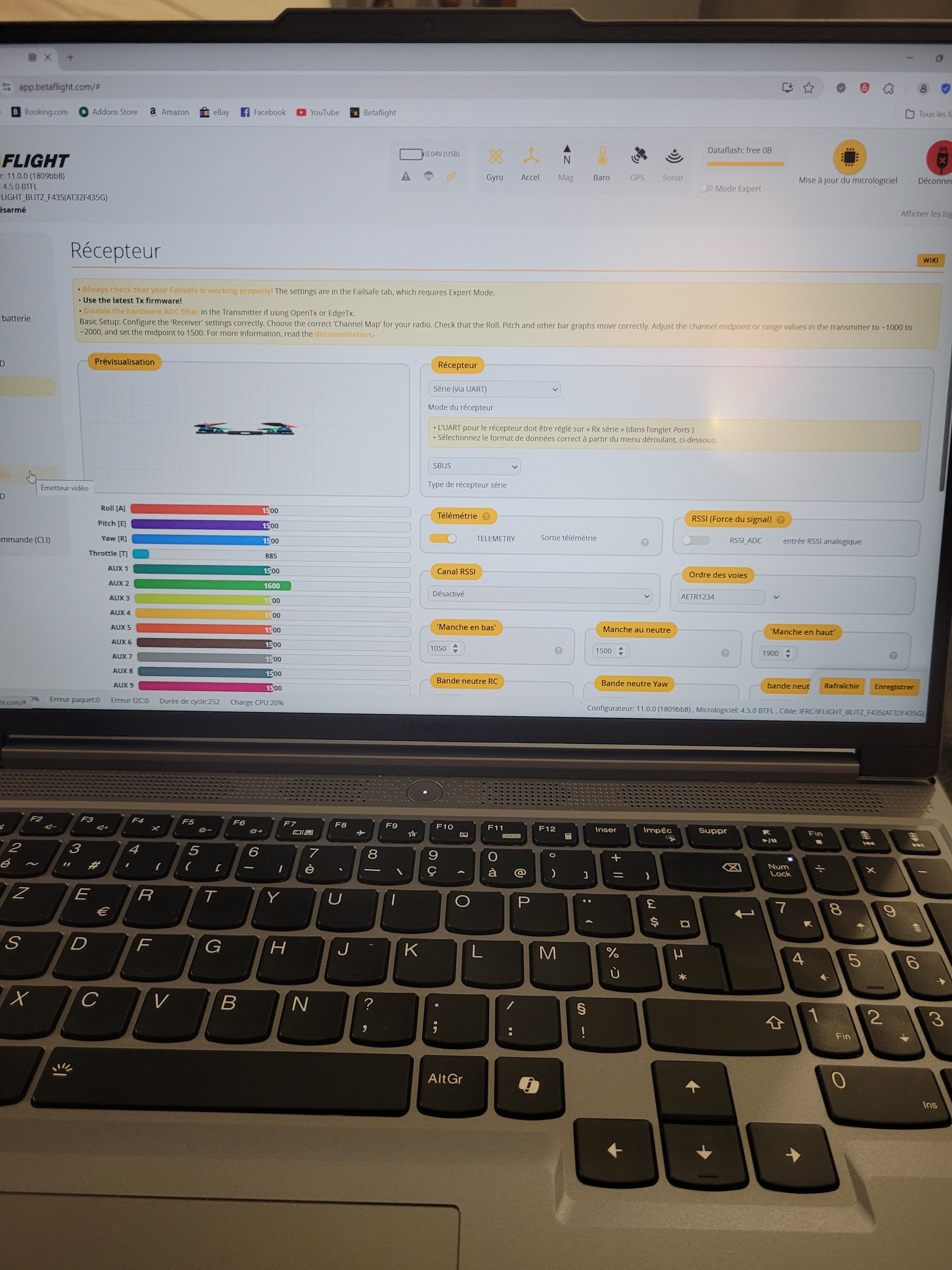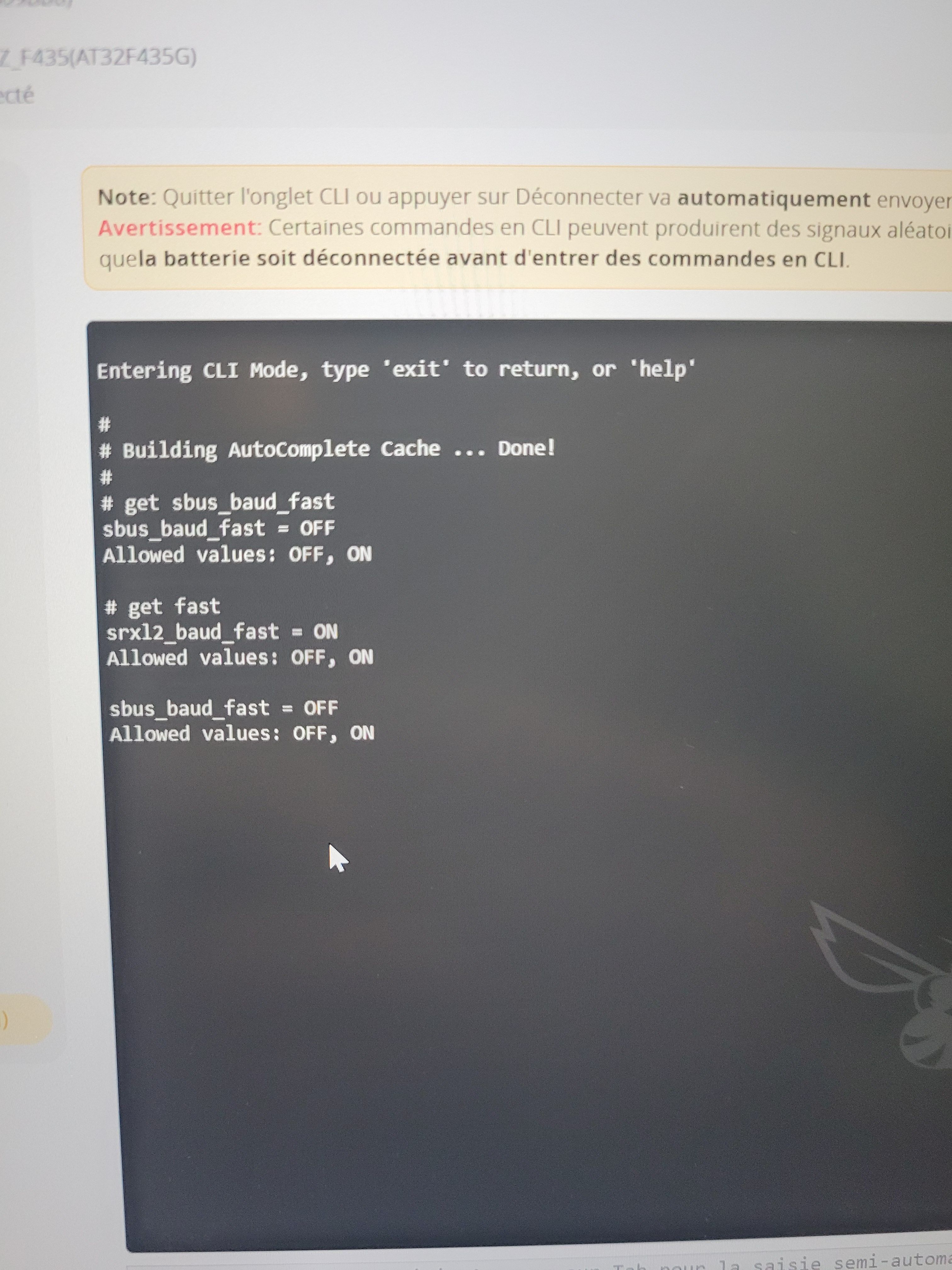gregory Posté(e) Juin 3 Auteur Signaler Posté(e) Juin 3 il y a 30 minutes, Motard Geek a dit : SBUS FAST = OFF donc t'es pas en fast sur la FC, t'as bien fait de passer de fast à standard c'est tout ce que je voulais dire D'accord merci donc j'ai binder à nouveau en mode standard et toujours rien, donc si la vitesse est bonne ,si il y a pas d'erreur dans l'onglet port , il faut chercher où ? Il y z peut-être une erreur dans les autres onglet émetteur vidéo ou bien récepteur ? à l’instant, gregory a dit : D'accord merci donc j'ai binder à nouveau en mode standard et toujours rien, donc si la vitesse est bonne ,si il y a pas d'erreur dans l'onglet port , il faut chercher où ? Il y z peut-être une erreur dans les autres onglet émetteur vidéo ou bien récepteur ?