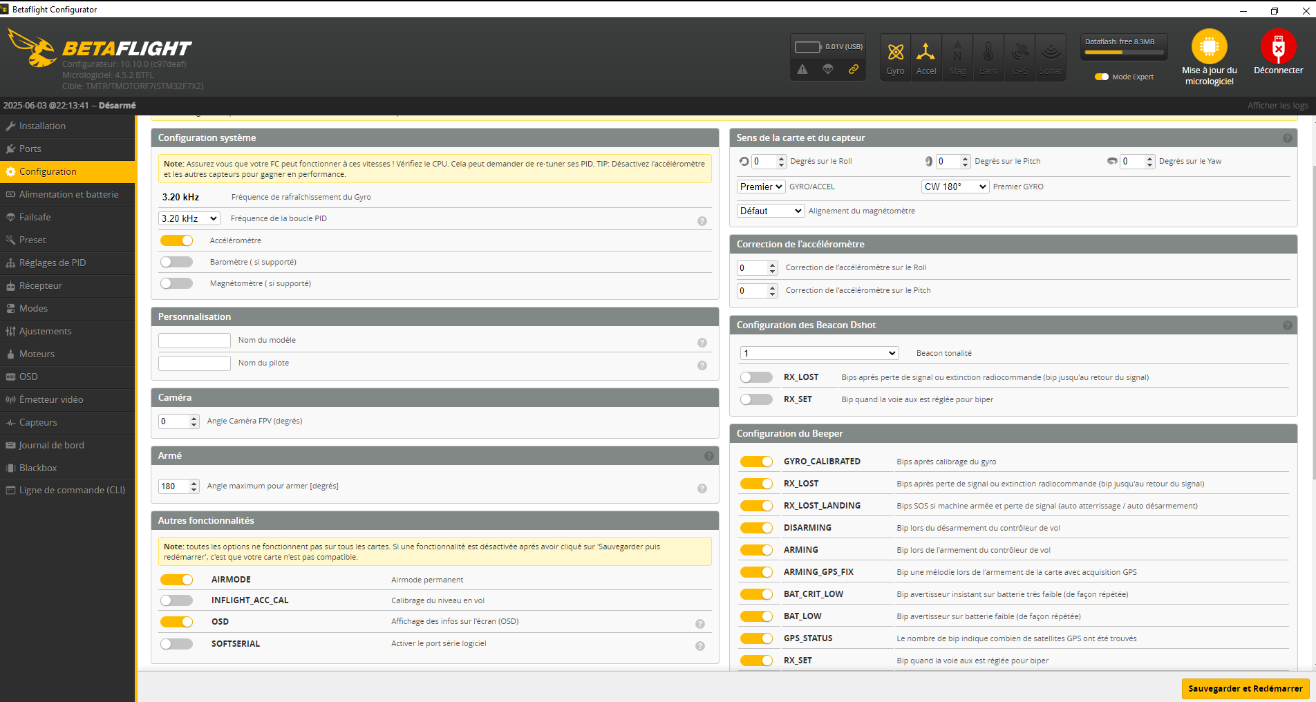 ManiaCoss Posté(e) Juin 3 Signaler Posté(e) Juin 3 Bonjour je suis débutant dans le milieu et j'ai un problème mon drone dès que je passe sur le dos . Ma config : -T-Motor Combo F7 HD FC + F55A PRO II '(condo 1000 uf) - moteur 2307 1750 KV - hélice HQ Freestyle Prop 5x4.3x3V2S - VTX DJI air unit 04 - TBS Crossfire Nano RX - Batterie Lipo Tattu R-Line 6S 1400mAh 130C V4 voilà pour ma configuration, j'ai suivi une grande partie des vidéos de We Are FPV pour monter mon drone. Celui-ci vole "correctement", j'entends par là un vol d'une lido complète, avec la FC à 40 degrés, températures constantes et les moteurs même pas tièdes. Mes les problèmes arrive dès que je passe sur le dos en faisant un roll à 180 degrés ou un pitch à 180 degrés, j'ai immédiatement une perte de contrôle. Mon drone ne répond plus au commande je ne perds pas la Vidéo et non plus le RX car je peux le désarmer et une fois crash, je le réarme et il repart nature peinture par contre, les moteurs sur l'axe duquel j'ai essayé de faire mon 180 sont nettement plus chauds. je me suis énormément renseigné grâce aux vidéos sur les Fameux PID, filtres. Je suis sur cette config en DSHOT 300 , Boucle PID et fréquence rafraîchissement Gyro 3.20 kHz, le max possible sur celle-ci. Si je ne me trompe pas, j'ai tous les filtres standard betaflight. Je comptais sur mon vol d'aujourd'hui pour essayer de tuning mais PID, mais je n'ai rien touché car le drone n'est pas fonctionnel à 100 %. Je ne sais pas si vous avez une piste où je peux commencer mes recherches cordialement, merci par avance. J'ai mis une photo d'un des craches enregistrés par la blackbox