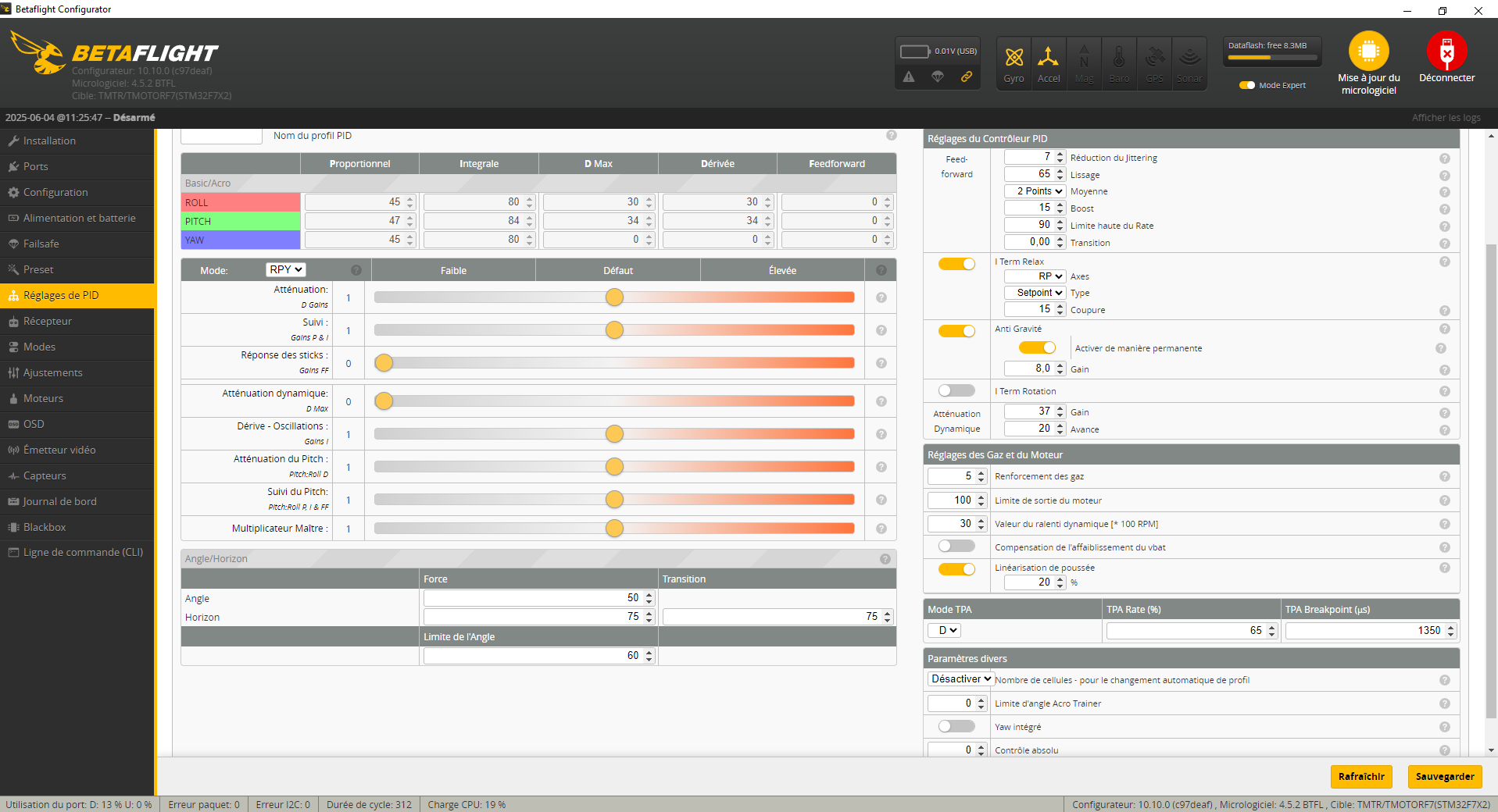 spid99 Posté(e) Juin 5 Signaler Posté(e) Juin 5 il y a 6 minutes, ManiaCoss a dit : cela peut venir des ESC ou de la FC qui serais défectueuse ? La FC possible, mais étonnant. Remets déjà tous les sliders des PID au centre. Faits nous une impression de ton onglet "Modes" pour vérifier un truc.