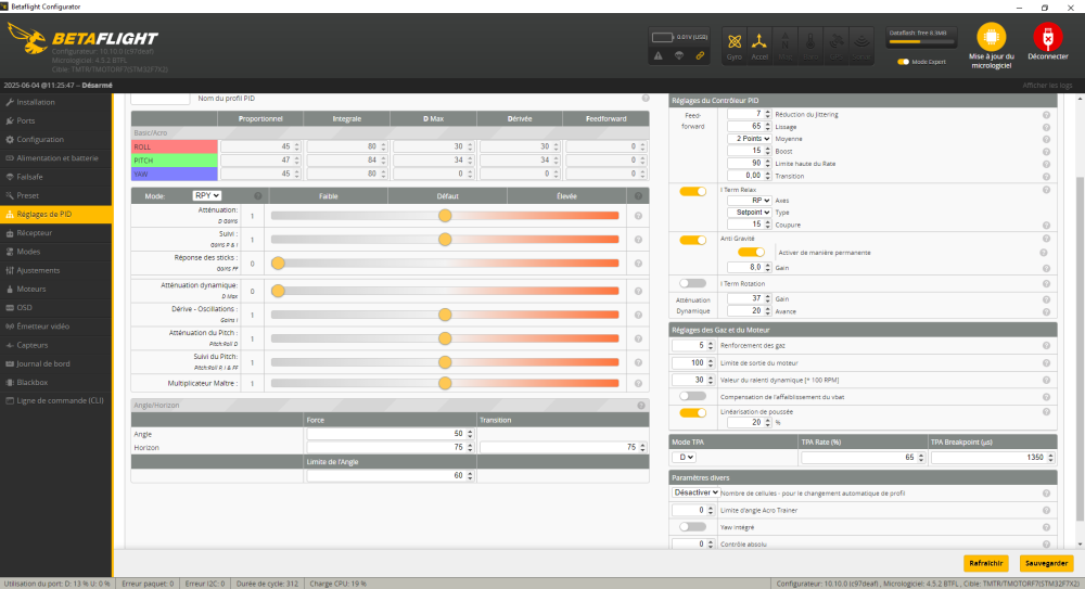 spid99 Posté(e) Juin 5 Signaler Posté(e) Juin 5 Ok désactive complétement "Angle", si tu veux et ce n'est pas du tout conseillé, active "horizon" à la place, mais perso je ne le ferais pas, apprends en "Acro" directement, c'est à dire sans angle ni horizon.