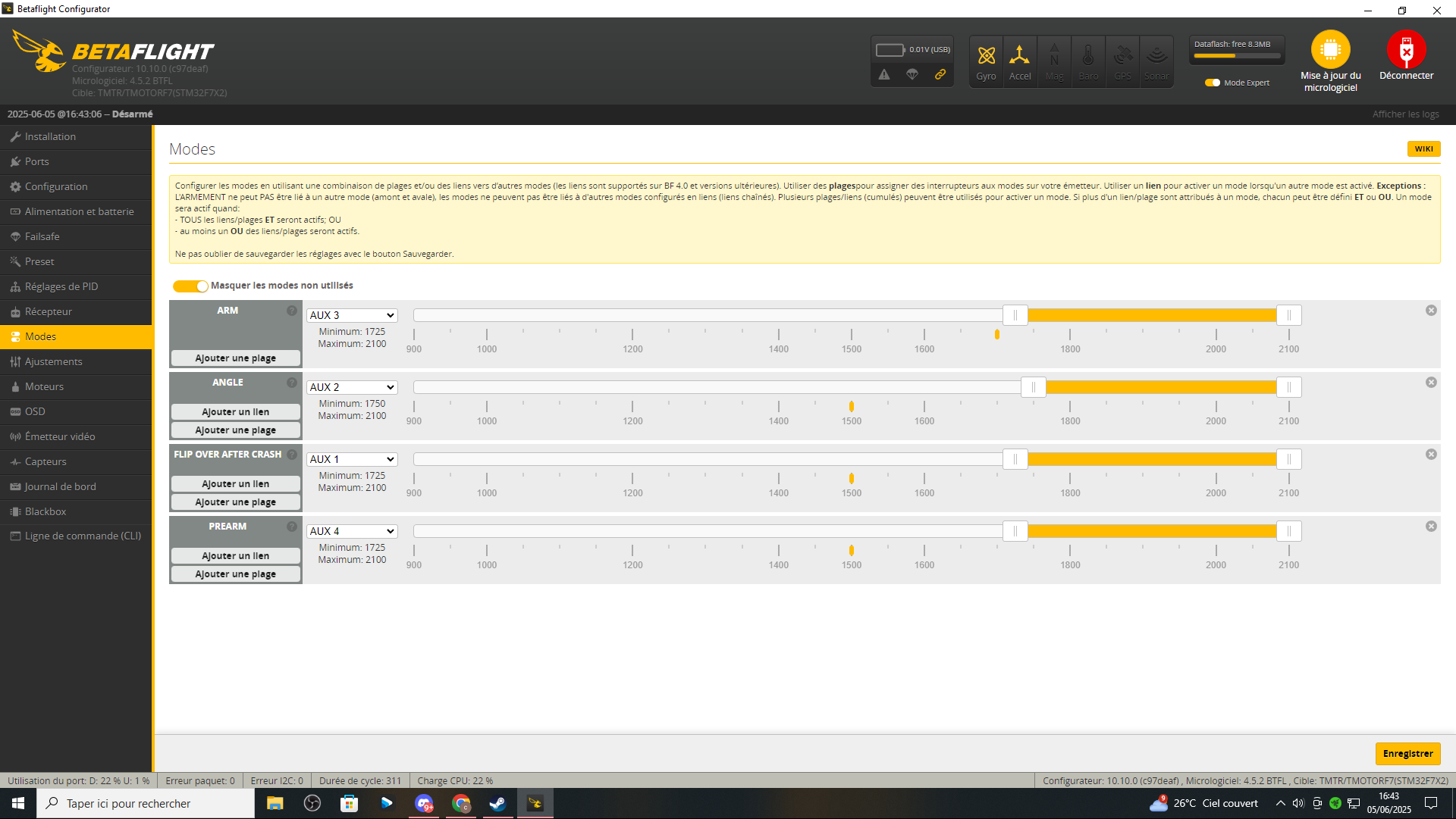 ManiaCoss Posté(e) Juin 3 Auteur Signaler Posté(e) Juin 3 dans l'onglet mode sur Betaflight, je teste en configurant un bouton pour le mode angle et j'étais dans le bon mode de vol car quand je l'ai activé, là j'étais bloqué à l'horizontale et le airmod dont tu parles se trouve dans quel onglet ? un point à noter, je n'ai pas passé l'ESC sur Belheli 32 car si je ne dis pas de bêtise, il n'est plus fonctionnel à ce jour pour mon ESC