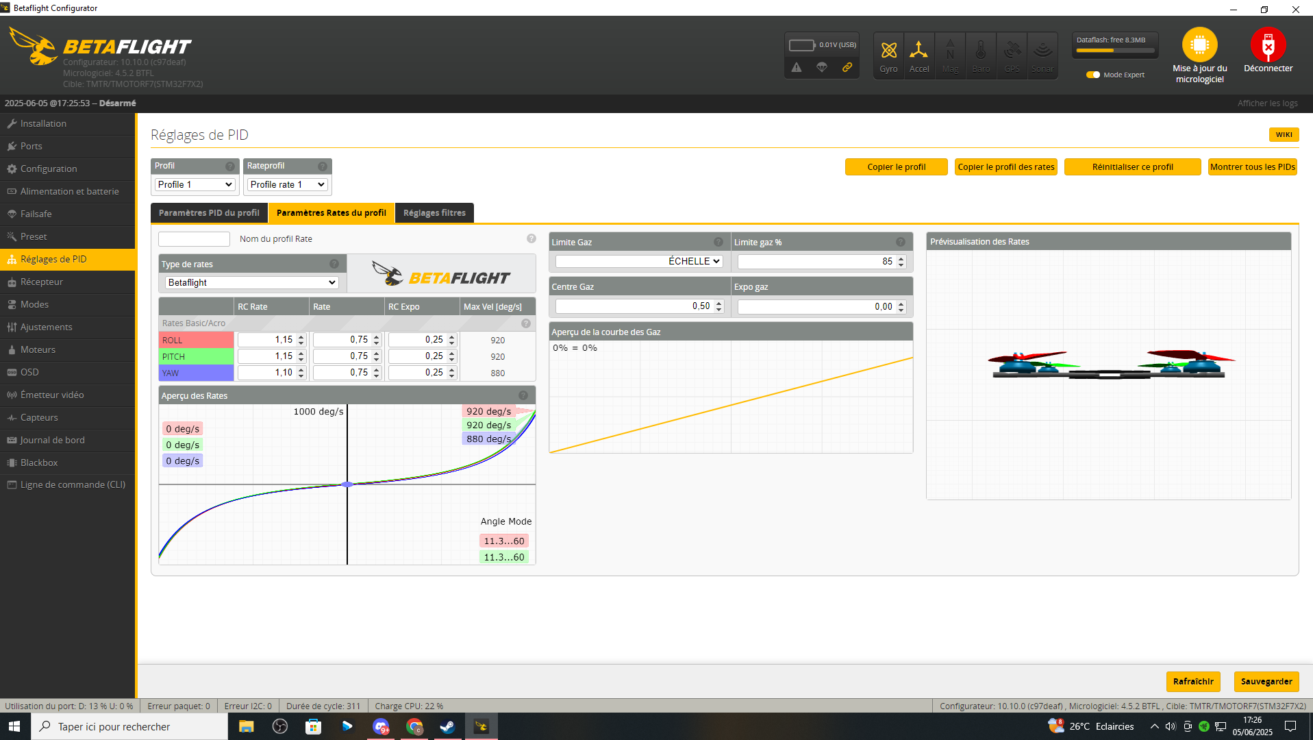spid99 Posté(e) Juin 5 Signaler Posté(e) Juin 5 (modifié) Post la vidéo de ton dernier vol (avec OSD) sur YT. Et mets là ici. Et remets le slider "FF" au centre stp. Pour un débutant (et pour moi) on ne sent pas de différences. Modifié (le) Juin 5 par spid99