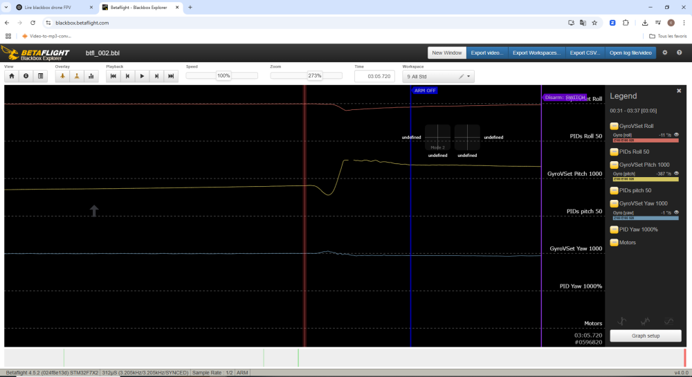 ManiaCoss Posté(e) Juin 3 Auteur Signaler Posté(e) Juin 3 oui je l'ai vue au moment où je t'ai envoyé le screen. Bon, ta réponse ne me rassure pas franchement ducoup Je cale, j'ai essayé de DSHOT 600 aujourd'hui, aucune différence notable. Peut-être les moteurs un peu plus chauds quand ça frizz. Franchement, je ne vois pas et j'ai un préarme donc je n'ai pas le temps de le réarmer en vol, ce qui m'a déjà coûté un bras. Mais je pense que si je réarme en vol, il répartirez. J'ai aussi mis des grands full pour voir si ce n'était pas l'intensité générale qui était trop forte, mais le drone les supportes bien