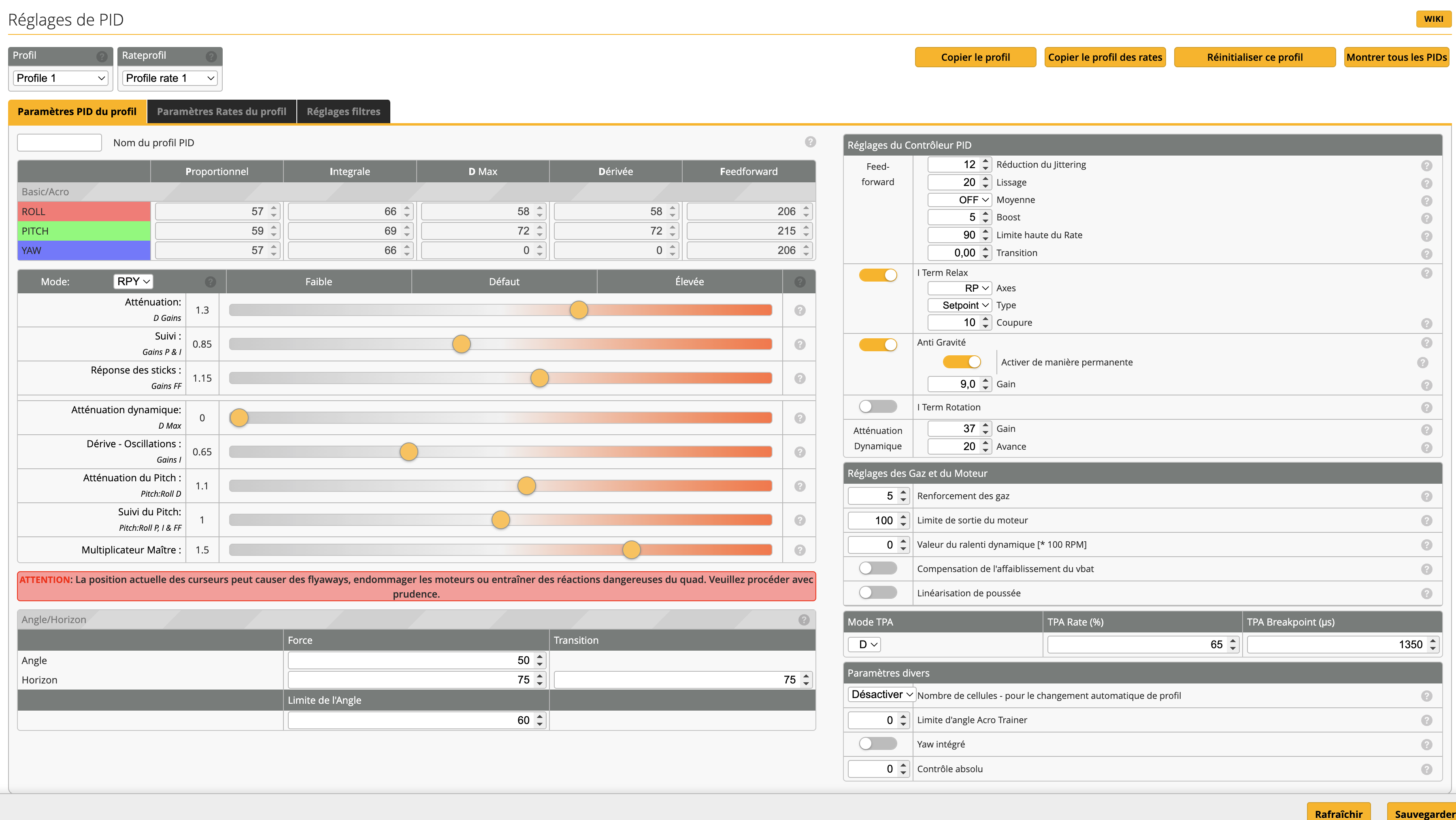 nochamo Posté(e) Juin 6 Signaler Posté(e) Juin 6 ton tuning me parait un peu etrange...... les valeurs de P semblent vraiment basses par rapports aux D....... ca meriterait sans doute de passer la BB sous pidtoolbox pour voir ce que ca dit. apres la lipo de 1600mah pour faire le tune, je suis pas persuadé que ca soit vraiment representatif de l’utilisation classique du jouet.....