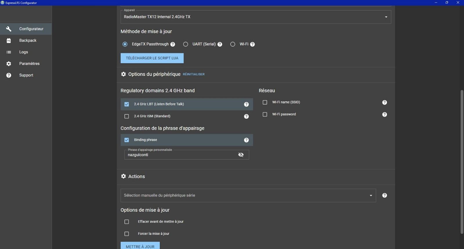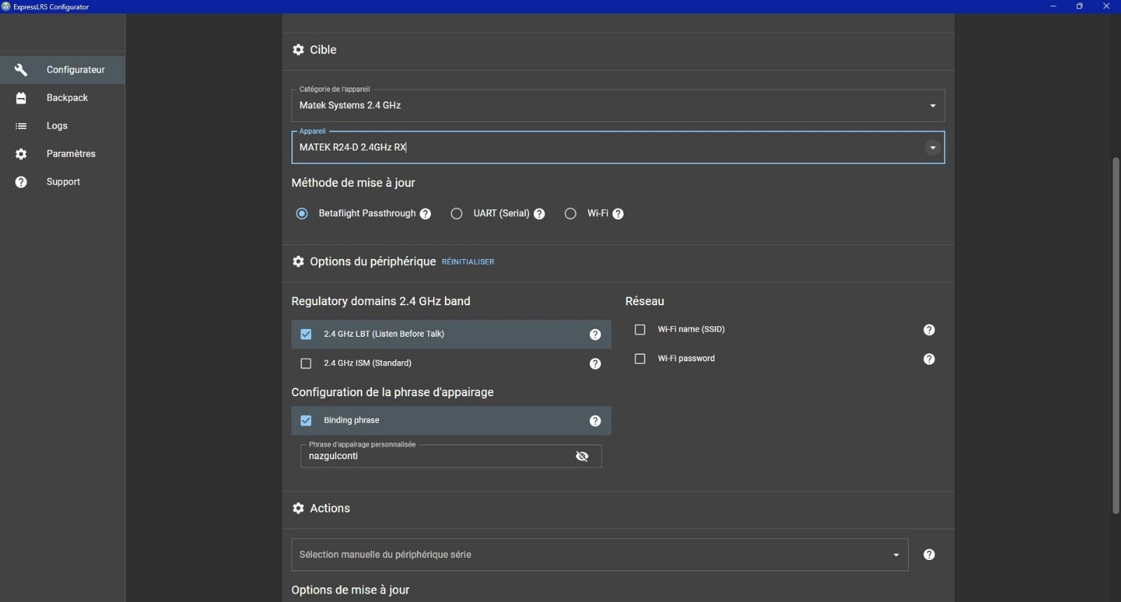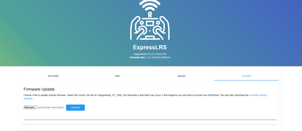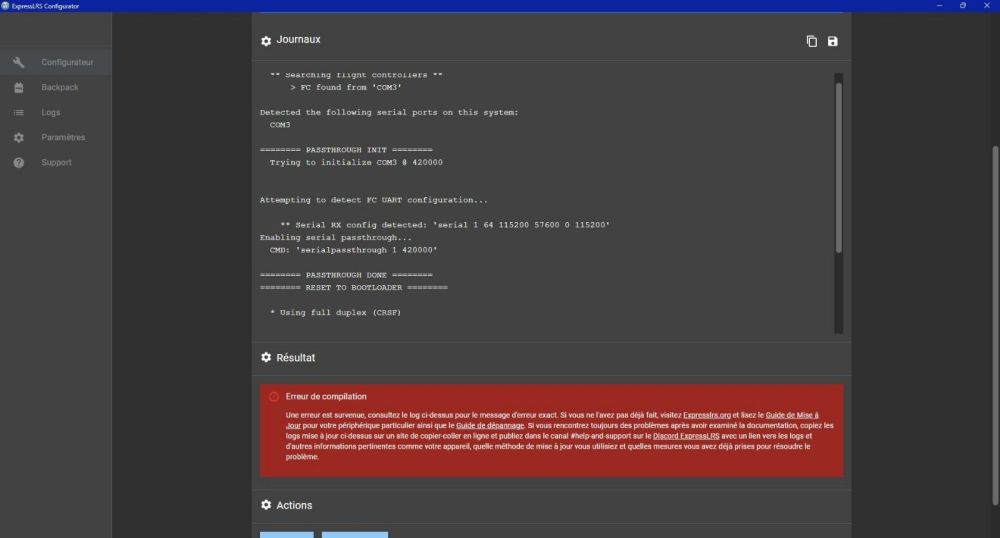 Conti Posté(e) Juin 10 Auteur Signaler Posté(e) Juin 10 Le 08/06/2025 at 22:38, Silverglade a dit : Je l'ai expliqué dans ce sujet : En fait c'est au module elrs qu'il faut te connecter directement pas à la FC Tu dois chercher en wifi ExpressLRS RX et en mot de passe "expresslrs", il va ouvrir une page en local (http://10.0.0.1/ normalement) avec son firmware à lui ou tu peux entrer une phrase de bind, le mettre a jour etc Ca te donnera aussi ta ref à utiliser pour chercher la cible de la maj d'ailleurs, je connaissais pas le miens, je l'ai trouvé la dessus (en dessous de ExpressLRS) Merci pour la réponse ! Quand j'upload le firmware j'ai un message d'erreur, ''impossible d'uploader le firmware '' Et c'est tout. Je vais remettre tout dans les cartons et le renvoyer à LaCameraEmbarquée, et faire binder par leurs services, C'est pas normal que ce soit aussi foireux. Si je trouve la solution je la posterai ici! Merci pour vos aides les gars Cordialement
