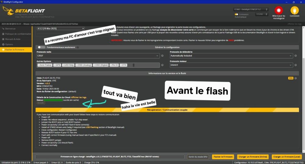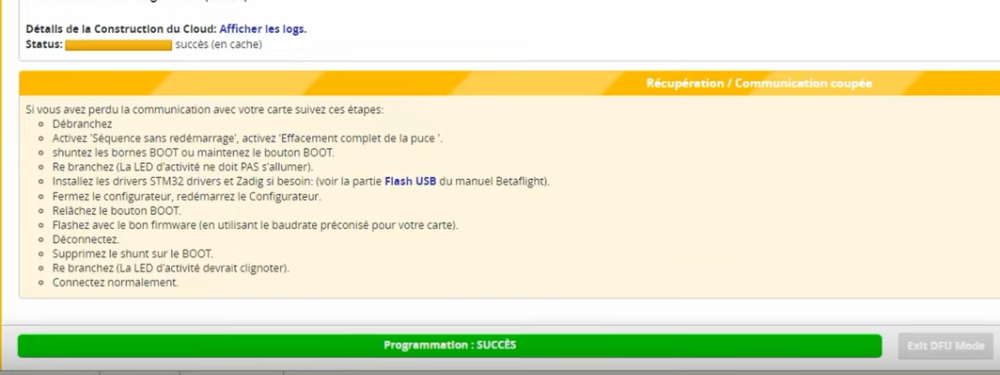 Conti Posté(e) Juin 8 Auteur Signaler Posté(e) Juin 8 il y a 10 minutes, Silverglade a dit : Sur ta photo "apres flash" j'ai vu qu'en haut a droite t'es toujours en DFU (mode bootloader) Et en bas il demande de redémarrer en bootloader ce qui déjà est chelou. Je pense que le flash n'a pas été fait, quand c'est ok tu dois avoir ça : Le flash se fait en "2 étapes", il charge d'abord, status succès au dessus, et ensuite tu flash, barre verte en bas. Mon 5" j'ai flasher en COMx il s'est débrouillé tout seul mais je sais que beaucoup de FC doivent être passé manuellement en DFU avant de flasher et reboot pour faire le flash Essaies de rebrancher le drone normalement en sélectionnant COMx au lieu de DFU pour voir si il est bien reconnu par BF ? (sans être dans l'onglet flash évidemment) Ok, j'ai regardé et effectivement il me dit DFU mais seulement après avoir essayé de flsaher (au moment où tout bug). avant le flash je n'ai pas le choix de COMx ou DFU (à moins que ce soit à faire dans une autre fenêtre?)