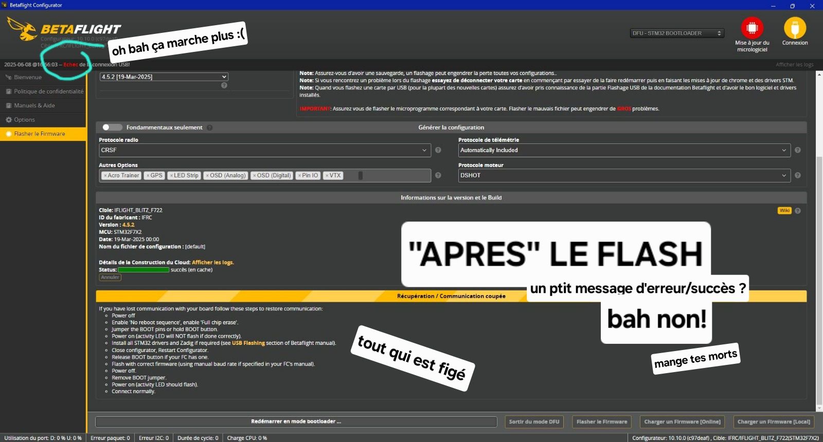 Conti Posté(e) Juin 8 Auteur Signaler Posté(e) Juin 8 il y a 12 minutes, Silverglade a dit : Désolé j'ai bien ris , ça m'a rappelé mon mobula7 quand je l'ai reçu, je pensais que ça prendrait 2 secondes à bindé et ça a pris tout un après midi ! J'ai finis par arriver à bind en me connectant au wifi du rx avec mon pc et en entrant ma phrase de bind. Aucun autre moyen n'a fonctionné non plus à part ça. T'as regardé le log comme indiqué pour voir l'erreur ? oui j'ai regardé le log, parfois il me dit que c'est une question de désactiver le mode ''no reset"", là il m'a dit que j'essaie de flasher UNIFIED_ESP32_8485_RX alors que le mien serait UNIFIED_ESP32_2400_RX et je sais pas comment lui dire de effectivement flasher le bon (puisqu'il le voit ce gros batard) et la je me rends compte que je n'arrive même pas à falsher la FC avec BetaFlight Configurator. Soit je trouve une solution dans le we, soit je mets le plus gros penalty du siècle dans tout ça afin de trouver la paix éternelle il y a 16 minutes, Silverglade a dit : Désolé j'ai bien ris , ça m'a rappelé mon mobula7 quand je l'ai reçu, je pensais que ça prendrait 2 secondes à bindé et ça a pris tout un après midi ! J'ai finis par arriver à bind en me connectant au wifi du rx avec mon pc et en entrant ma phrase de bind. Aucun autre moyen n'a fonctionné non plus à part ça. T'as regardé le log comme indiqué pour voir l'erreur ? merci pour ta réponse! je pensais pas que quelqu'un répondrait aussi rapidement!!