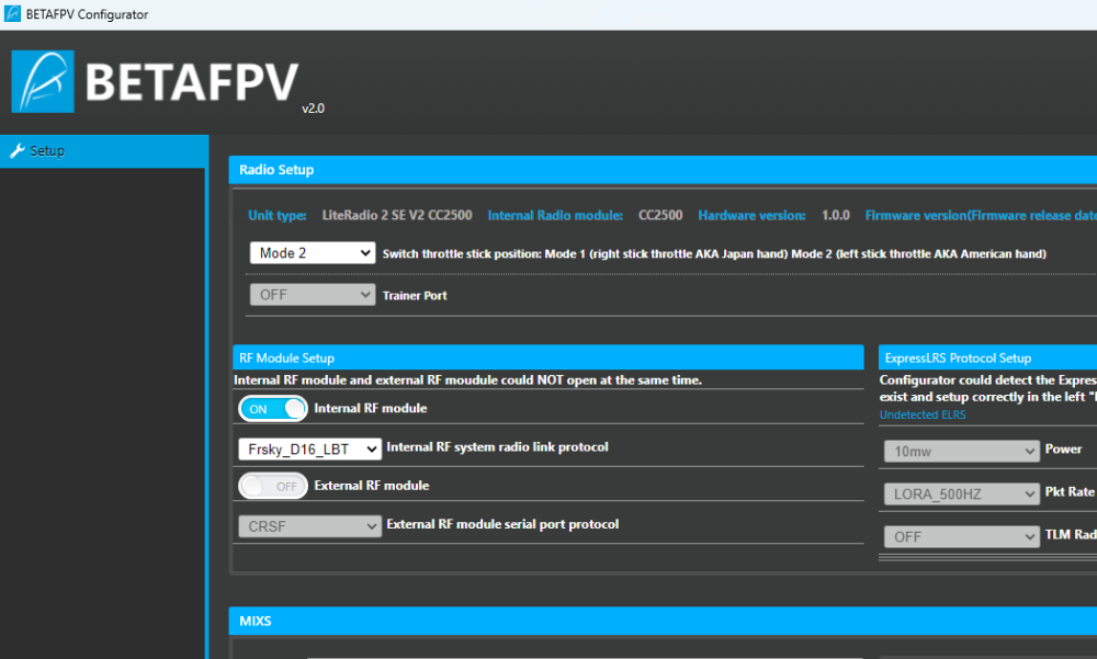 J'avais acheté un kit sur LBC avec une radio BETAFPV LiteRadio2 SE et un récepteur XSR-SIM pour le relier sans-fil au PC, que je n'ai jamais réussi à appairer.