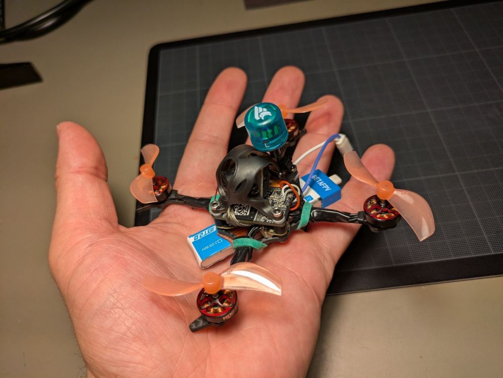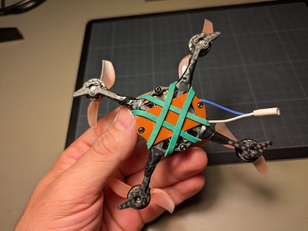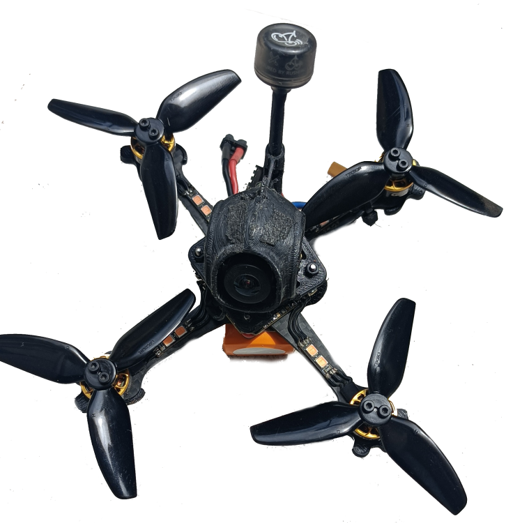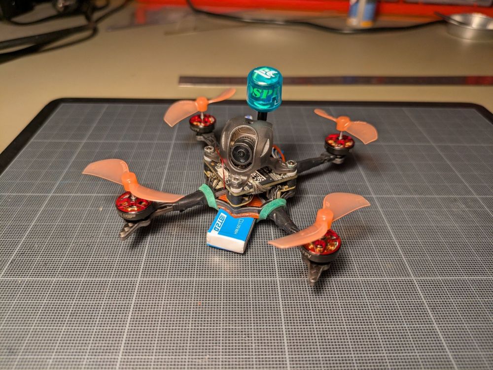 sjollo Posté(e) Juin 11 Signaler Posté(e) Juin 11 (modifié) Topic Attachments Salut à tous et à toutes, Je voulais vous partager mon nouveau build, ou plutôt la conversion de mon tiny (meteor 75 HD) en toothpick 2"5. Même si il n'est plus à la mode depuis la sortie du O4 de DJI, j'adore mon tiny HD walksnail (meteor 75 HD), et je vole avec depuis 2 ans en intérieur. Malgré quelques mise à jours (type Meteor 75 pro), il commence à être abimé en dehors de la FC/VTX. En plus, avec l'été qui arrive, je sais que je vais voler de plus en plus en extérieur, et comme j'ai progressé en pilotage, je sais que j'ai besoin de plus de patate. L'idée est donc de convertir mon drone en toothpick 1s pour tester l'assemblage méca, le format 2"5 et les réglages, puis de passer ensuite en 2s-3s en changeant la FC. L'ensemble fait moins de 40g : je suis carément content vu le format HD, car c'est même moins que le drone d'origine. C’est un peu lourd pour du freestyle/race, mais une fois en passé en 2s-3s ca devrait être carrément bien sans beaucoup de poid supplémentaire! L'assemblage est assez simple. J'ai dû repercer la canopy pour passer les vis M2 de la frame. L'inversion de la carte du VTX est nécessaire pour monter l'antenne, car ça coince dans le sens d'origine. Le tout est assemblé avec les dampers du Mobula8 HD qui permettent de maintenir un bon espace entre la FC et le VTX tout en ayant un bon amortissement des cartes. J'ai soudé directement les moteurs sur la FC. Je n'ai pas pris la peine de dessouder les connecteurs d'origine, mais j'ai soudé les fils du coté oposé au connecteurs en m'aidant des broches de ceux-ci. Les fils sont un peu justes, mais ça m'a permis de ne pas ralonger les fils moteur (galère). A mon grand regret je n'ai pas pu passer de gaine thermo sur les bras pour serrer les fils et j'ai du finir au scotch, mais bon. La fixation de l'antenne est réalisée avec un strap nylon, et c'est correct, sans plus... il faut que j'améliore ce point, néanmoins l'antenne est verticale. Le plus galère a été la fixation des lipo sous la frame. En effet, les vis sont prohéminentes, et j'ai peur de flinguer mes lipo à l'atterrisage. J'ai donc rajouté un pad en silicone antidérapant, que j'ai troué pour faire passer les têtes de vis et le connecteur USB. Au final une fois la lipo fixé avec les élastiques le montage est plutôt solide! Je n’ai pas encore beaucoup testé, mais on sent que l'ensemble est plus "raide" et j'ai moins de vibrations qu'avant. Je vais revoir les réglages ce weekend pour voir si je peux supprimer des filtres. On doit pouvoir gagner quelques grammes en remplacant les vis par des vis nylon et en trouvant une antenne plus légère, en dessoudant les connecteurs, etc... Mais vu que l'objectif est la conversion en 2s je me contente de ça pour l'instant. N'hésitez pas à laisser des commentaires et à lancer des idées pour le passage en 2-3s! POIDS : 40 grammes Liste des composants Frame Toothpikfrite 2”5 de Parallax FPV 10 € FC Beta fpv F4 1S 5A AIO 38 € ESCs Aio Moteurs 4 x Betafpv 1102 22000kv 40 € Jeu d'hélices 2 ou 3 pales Caméra FPV Walksnail Avatar HD Mini 1S 140 € Antenne vTx Antenne Osprey 5.8Ghz 40mm 6 € Prix total : 234 € Modifié (le) Juin 15 par sjollo 2 1