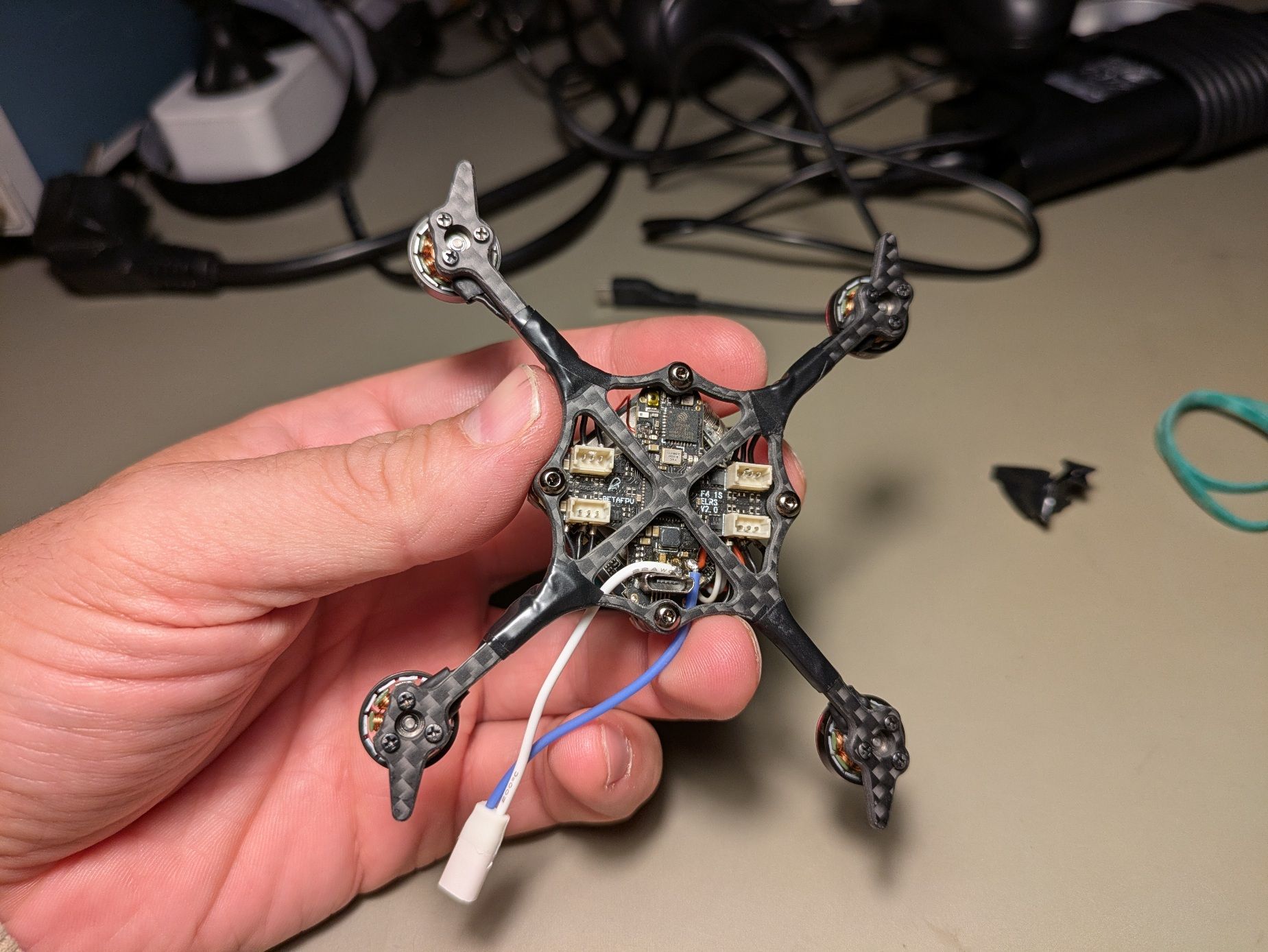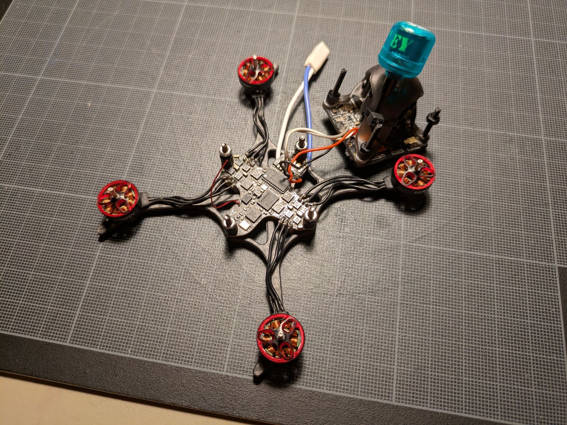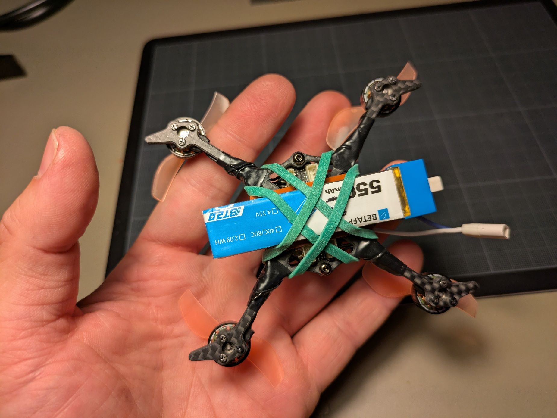 sjollo Posté(e) Juin 11 Signaler Posté(e) Juin 11 (modifié) Topic Attachments Salut à tous et à toutes, Je voulais vous partager mon nouveau build, ou plutôt la conversion de mon tiny (meteor 75 HD) en toothpick 2"5. Même si il n'est plus à la mode depuis la sortie du O4 de DJI, j'adore mon tiny HD walksnail (meteor 75 HD), et je vole avec depuis 2 ans en intérieur. Malgré quelques mise à jours (type Meteor 75 pro), il commence à être abimé en dehors de la FC/VTX. En plus, avec l'été qui arrive, je sais que je vais voler de plus en plus en extérieur, et comme j'ai progressé en pilotage, je sais que j'ai besoin de plus de patate. L'idée est donc de convertir mon drone en toothpick 1s pour tester l'assemblage méca, le format 2"5 et les réglages, puis de passer ensuite en 2s-3s en changeant la FC. L'ensemble fait moins de 40g : je suis carément content vu le format HD, car c'est même moins que le drone d'origine. C’est un peu lourd pour du freestyle/race, mais une fois en passé en 2s-3s ca devrait être carrément bien sans beaucoup de poid supplémentaire! L'assemblage est assez simple. J'ai dû repercer la canopy pour passer les vis M2 de la frame. L'inversion de la carte du VTX est nécessaire pour monter l'antenne, car ça coince dans le sens d'origine. Le tout est assemblé avec les dampers du Mobula8 HD qui permettent de maintenir un bon espace entre la FC et le VTX tout en ayant un bon amortissement des cartes. J'ai soudé directement les moteurs sur la FC. Je n'ai pas pris la peine de dessouder les connecteurs d'origine, mais j'ai soudé les fils du coté oposé au connecteurs en m'aidant des broches de ceux-ci. Les fils sont un peu justes, mais ça m'a permis de ne pas ralonger les fils moteur (galère). A mon grand regret je n'ai pas pu passer de gaine thermo sur les bras pour serrer les fils et j'ai du finir au scotch, mais bon. La fixation de l'antenne est réalisée avec un strap nylon, et c'est correct, sans plus... il faut que j'améliore ce point, néanmoins l'antenne est verticale. Le plus galère a été la fixation des lipo sous la frame. En effet, les vis sont prohéminentes, et j'ai peur de flinguer mes lipo à l'atterrisage. J'ai donc rajouté un pad en silicone antidérapant, que j'ai troué pour faire passer les têtes de vis et le connecteur USB. Au final une fois la lipo fixé avec les élastiques le montage est plutôt solide! Je n’ai pas encore beaucoup testé, mais on sent que l'ensemble est plus "raide" et j'ai moins de vibrations qu'avant. Je vais revoir les réglages ce weekend pour voir si je peux supprimer des filtres. On doit pouvoir gagner quelques grammes en remplacant les vis par des vis nylon et en trouvant une antenne plus légère, en dessoudant les connecteurs, etc... Mais vu que l'objectif est la conversion en 2s je me contente de ça pour l'instant. N'hésitez pas à laisser des commentaires et à lancer des idées pour le passage en 2-3s! POIDS : 40 grammes Liste des composants Frame Toothpikfrite 2”5 de Parallax FPV 10 € FC Beta fpv F4 1S 5A AIO 38 € ESCs Aio Moteurs 4 x Betafpv 1102 22000kv 40 € Jeu d'hélices 2 ou 3 pales Caméra FPV Walksnail Avatar HD Mini 1S 140 € Antenne vTx Antenne Osprey 5.8Ghz 40mm 6 € Prix total : 234 € Modifié (le) Juin 15 par sjollo 2 1