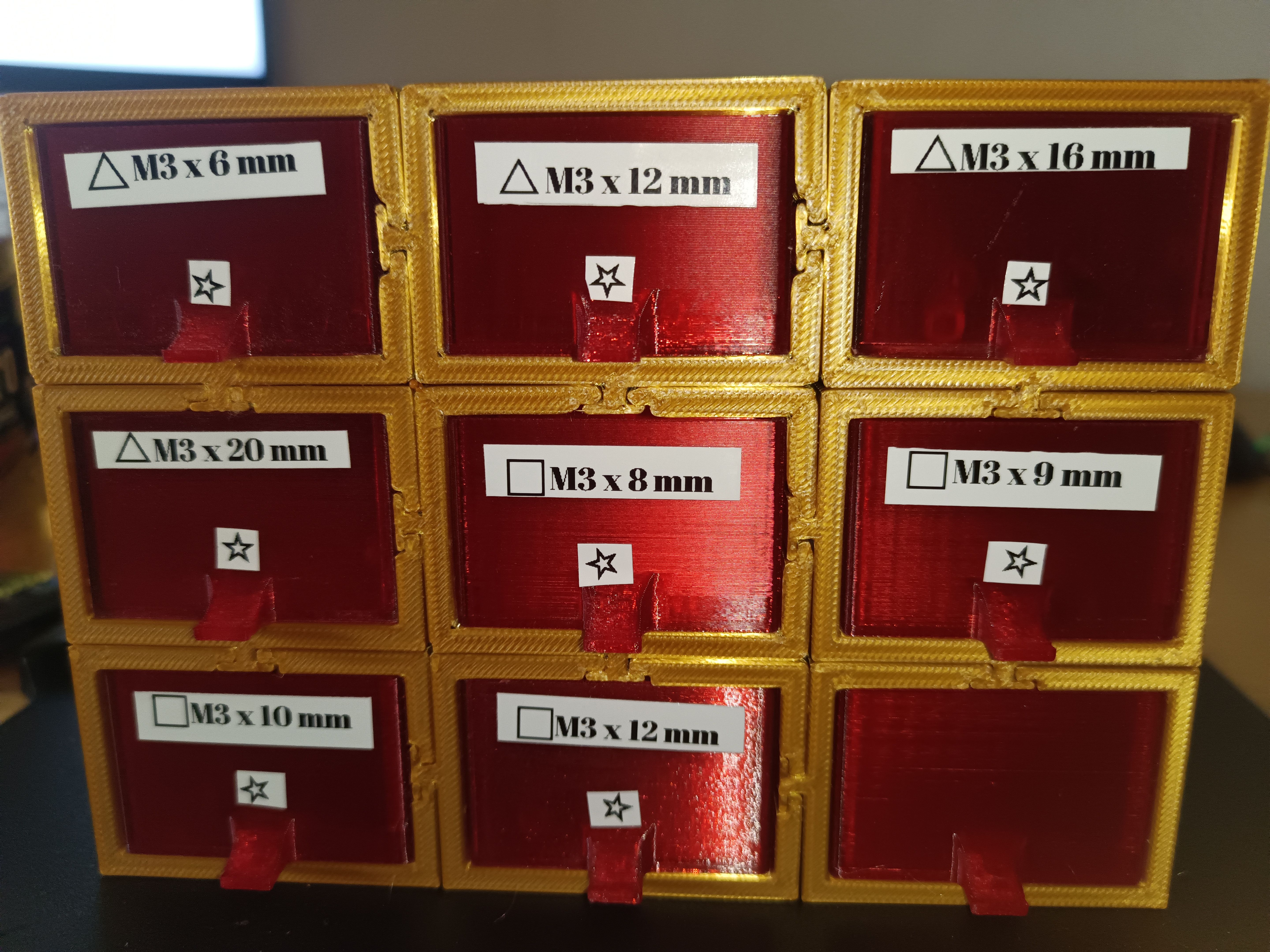 Ptitloup Posté(e) Juin 12 Signaler Posté(e) Juin 12 (modifié) Je partage ma création, j'en avais ras le bol d'avoir des boites de vis partout alors j'ai créé ce design. On peut mettre autant de tiroirs qu'on veut en hauteur et en largeur. Il fait très humide aujourd’hui, raison pour laquelle certain tiroir sont limites, sinon les premiers imprimés hier avec humidité 12% ajustement parfait. Modifié (le) Juin 12 par Ptitloup 1