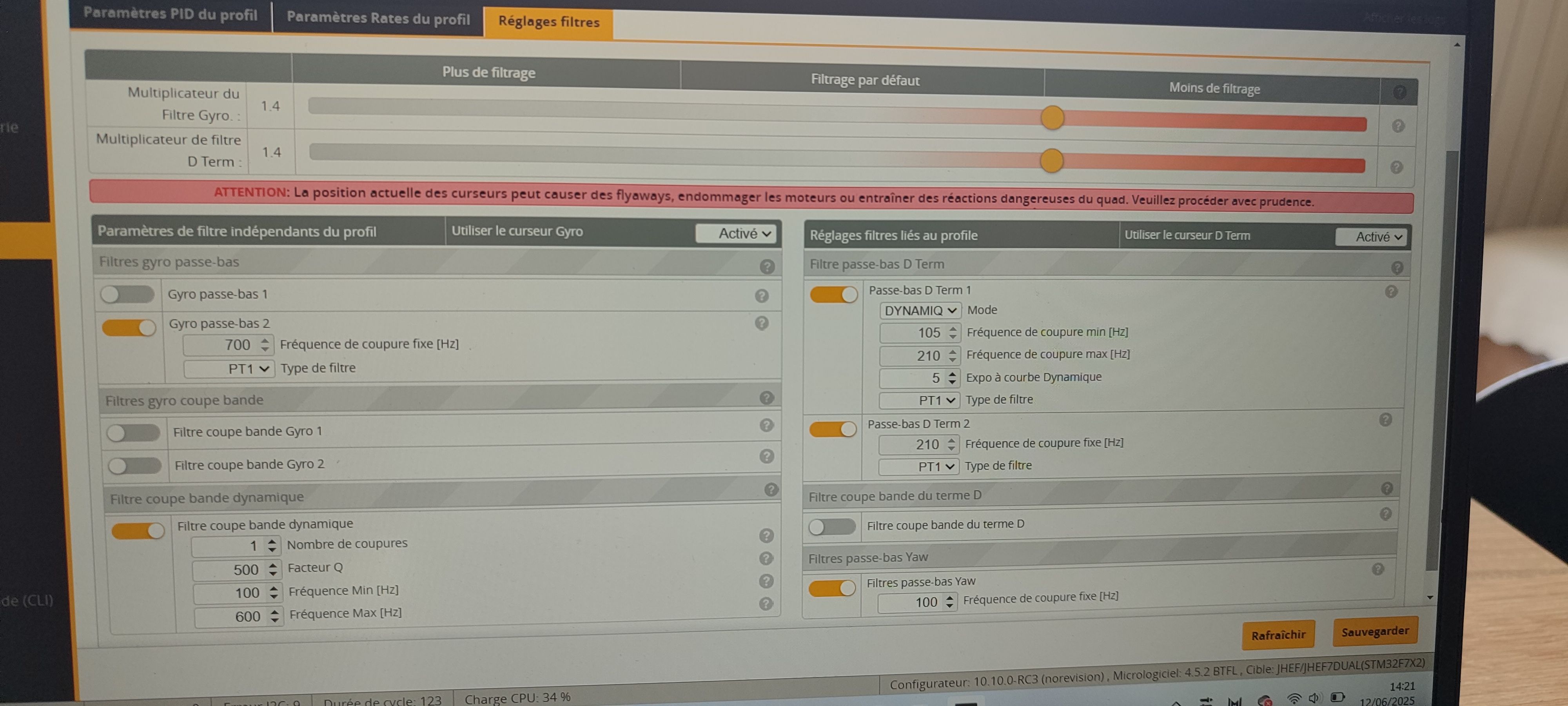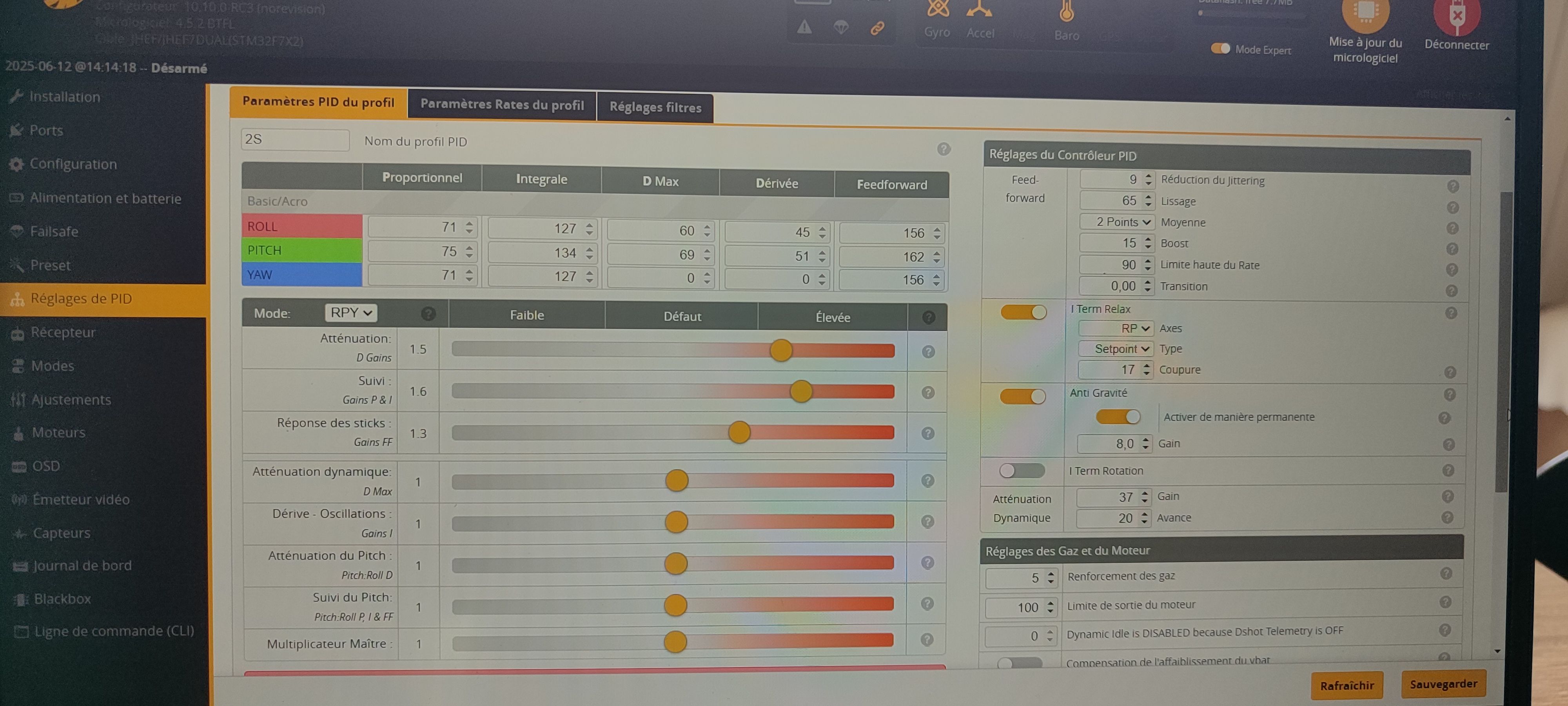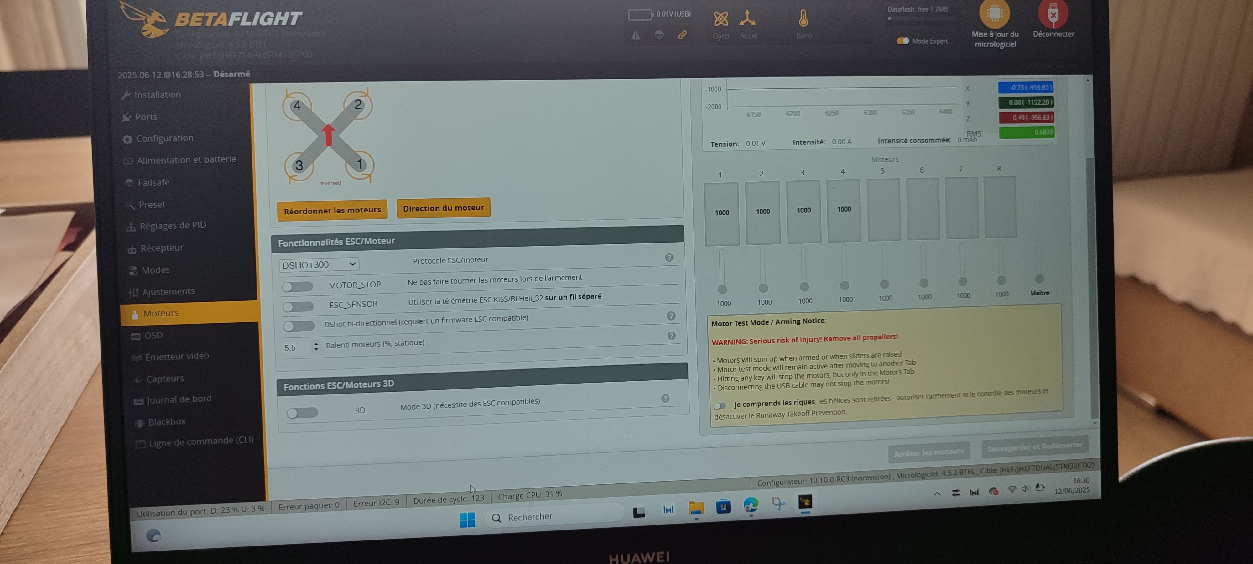 Motard Geek Posté(e) Juin 12 Signaler Posté(e) Juin 12 Alors déjà la vitesse du DShot c'est pas du hasard mais en fonction de ta PID loop, surtout si t'as activé le filtre RPM (auquel cas faut avoir mis le bon nombre d'aimants) Ca dit quoi à ce niveau ? Et dans l'onglet moteurs, pas d'erreur et tous tournent correctement un à un ?