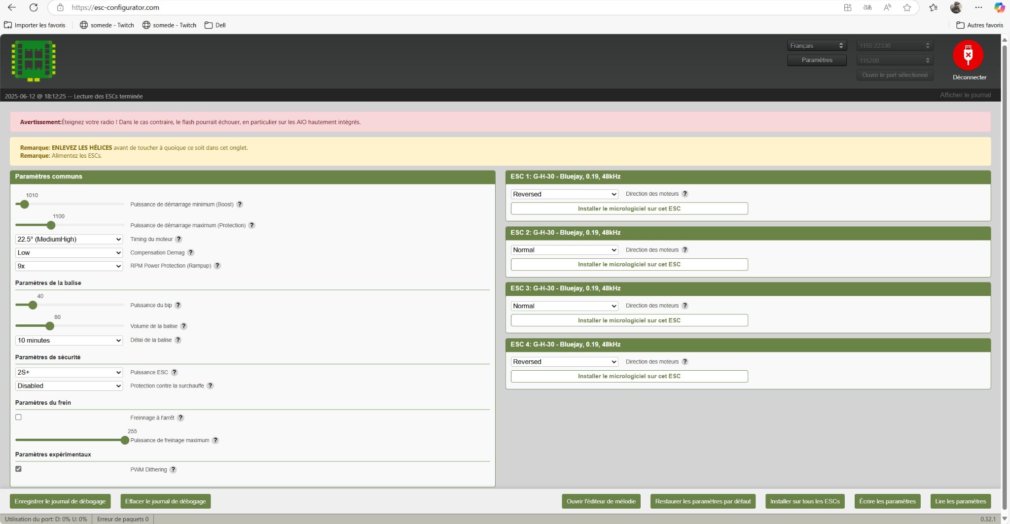 Solution Tor-K Posté(e) Juin 14 Auteur Solution Signaler Posté(e) Juin 14 Bon j'ai tenté la solution de @Attafr et d'un pilote sur le messenger WAF. Ce dernier qui a exactement le même drone avec la même configuration que moi, m'a conseillé de flasher via esc-configurator.com en version 0.19 à 48khz et ça fonctionne. Je mets la capture écran du paramétrage qu'io m'a donné et que j'ai flashé, suite à son contact en MP. Un grand merci encore à toi Gaetan J'ai fais un test rapide, ça vole et les moteurs s'arment sans soucis sans peiner à se lancer. Ils sont tout de nouveau synchronisés. 1
