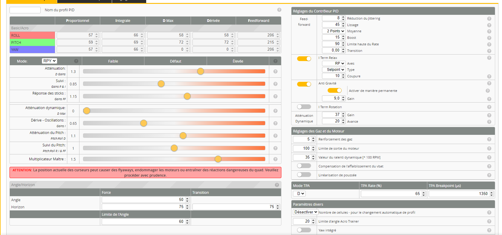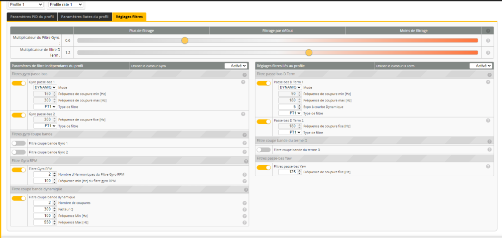mike38 Posté(e) Juin 22 Signaler Posté(e) Juin 22 Bien le bonjour , Depuis quelques mois , mon nouveau bébé est un REKON7. Depuis le début je vol avec en stock betaflight et honnêtement , ça fait le café. Mais vu que je vol souvent en montagne , le vent le ballote quand même pas mal et parfois, c'est pas top. Je me suis donc lancé dans une session de Tune après avoir regarder au moins 5 fois la vidéo de Jerome et j'ai abandonné après une aprèm entière a pédaler dans la semoule. En trainant sur des chaines anglophones ( UAV TECH) , je vois qu'il met a disposition un tune pour 7" dans les preset ( je sais , c'est pas bien) . Je le prend et après avoir testé , ben c'est pas si mal. Le seul petit inconvénient et que j'ai l'impression que mes moteur font du bruit , comme s'il "claquait" Mais rien de méchant , pas de surchauffe moteur ni d'emballement en vol. Et que sur des accélérations , le kwad tremble un peu . Idem en cruising , c'est pas grand chose mais ça se sent Ma question est donc la suivante , est -ce possible de voir comment améliorer ce point ? Dans la vidéo de l'O3 avec rocksteady , on peut voir des tremblements je vous joins la BB et les réglages, j'ai pas l 'impression d'avoir trop de bruit. pour le build : frame REKON7 / FC speedybee F7V3/ ESC BLHELI32 50 A / moteurs 2206.5 1300kv. ESC en 24KhZ et flasher en 32.9 Merci d'avance ,