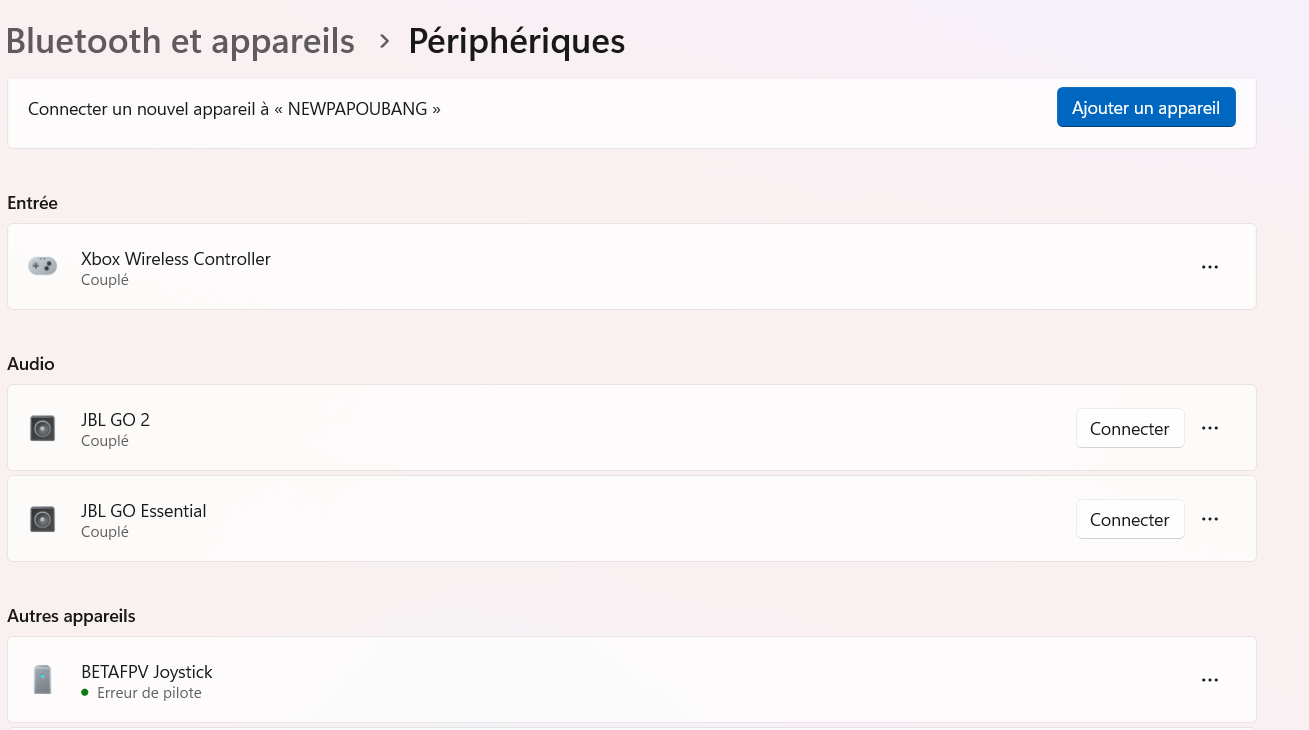 GogoFPV Posté(e) Juin 24 Signaler Posté(e) Juin 24 Bonjour, Je débute le fpv et pour cela je m'entraîne à côté sur Simulateur, TRYP FPV. Sur mon PC perso, quand je branche la literadio, la manette est détectée par mon blutooth mais affiche erreur de pilote. Je me suis un peu renseigné alors j'ai mis à jours les pilotes, désinstaller les pilotes mais toujours rien ... En étant désespéré j'ai demandé à chatgpt une solution qui lui m'a conseillé d'installer zadig (je ne sais même pas ce que c'est mdr). Alors je l'ai fais et ça encore plus planté et je suis même parvenu à perdre mon Bluetooth. Donc après une réinitialisation total de mon ordi j'ai enfin récupéré Bluetooth … Ne voulant pas refaire la même bêtise je fais appel à ce forum. Je précise que je fais du simu sur un autre ordi portable et ça fonctionne correctement. Merci beaucoup ! Si vous voulez des screens je peux vous en donner.