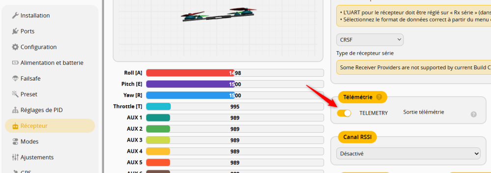 Patrick_S Posté(e) Juillet 2 Auteur Signaler Posté(e) Juillet 2 il y a 48 minutes, Tex_GG a dit : C'est pas un "true diversity", mais c'est un dual antenna : https://www.drone-fpv-racer.com/recepteur-elrs-24g-ep1-dual-tcxo-happymodel-10573.html OK, merci pour l'info @Tex_GG ! J'ai fait quelques recherches et ai suivi quelques tutos... Du coup je me suis rendu compte que je n'avais pas activé la "Sortie télémétrie" dans l'onglet "Récepteur" de Betaflight : (je viens de l'activer) J'ai fait un Bench Test comme indiqué dans le post de @nochamo, et j'ai une valeur autour de -26 dbm, je pense que c'est pas mal du coup. Du coup ma question du soir : @Motard Geek, @Tex_GG, @nochamo, @Attafr : Pensez-vous que le fait que j'ai oublié cette coche "Sortie Télémétrie" pourrait expliquer mes messages "Télémétrie perdue, Télémétrie retrouvée" ? Lors de mes tests devant Betaflight, je n'ai pas du tout ces messages, alors que la dernière fois ça l'avait fait 2-3 fois... Merci d'avance pour vos retours Bonne soirée Patrick