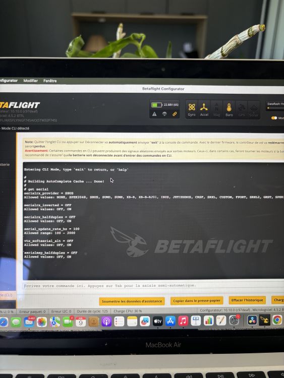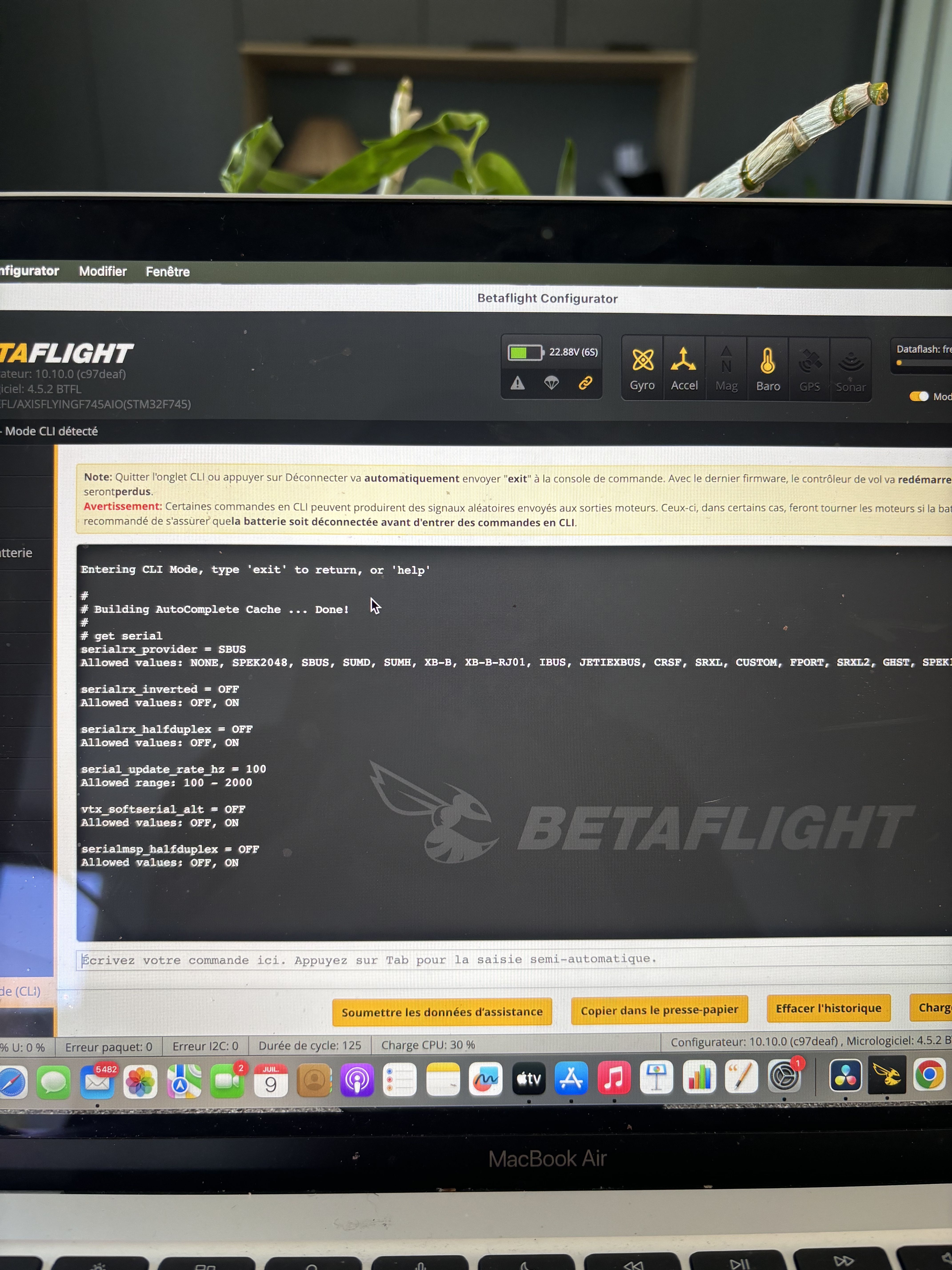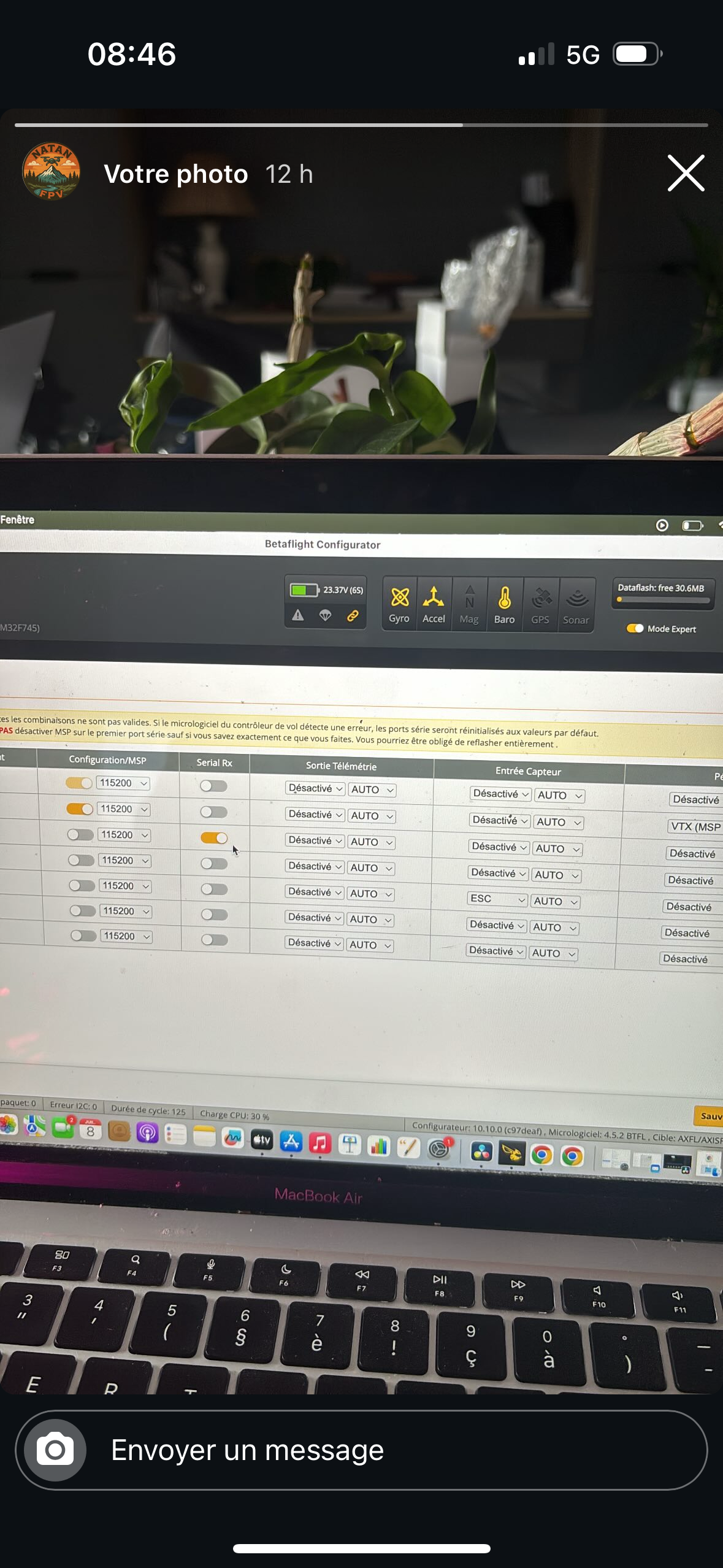 nathanfpv14 Posté(e) Juillet 9 Signaler Posté(e) Juillet 9 Bonjour, voilà quelques jour que je galère à connecter mon cineon c35 v3 o4 pro à ma radiocommande 3 dji fpv. je vol avec le protocole sbus puisque je vol avec la rc dji connecté à mes google v3. jai bien flasher en mettant sbus comme protocole et j’ai bien sélectionner sbus dans l’onglet récepteur de bf. J’ai essayé avec le sbus fast on et off rien n’y fait. jai regarder tous les tutos possible et inimaginable, j’ai recommencer j’ai même changer d’ordinateur et rien n’y fait, je vous met quelque capture d’écran de comment est monté le drone et surtout mes paramètres betaflight. si quelqu’un sait m’aider j’en serai vraiment plus que reconnaissant, merci ! je commence de désespérer.