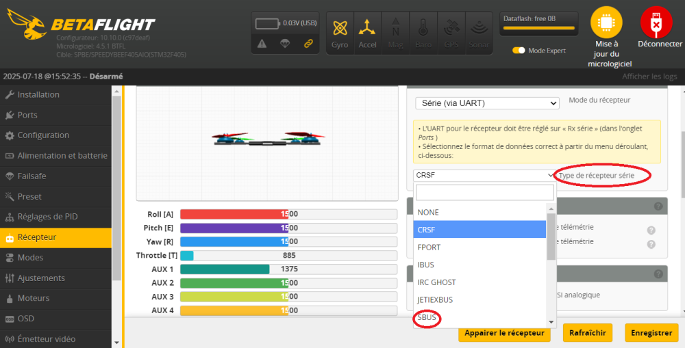 spid99 Posté(e) Juillet 18 Signaler Posté(e) Juillet 18 OK, ton drone est en ELRS, c'est pourquoi il ne voit pas le SBUS. Essaie d'entrer cette instruction dans le CLI : Citation set expresslrs_clearlink = OFF save