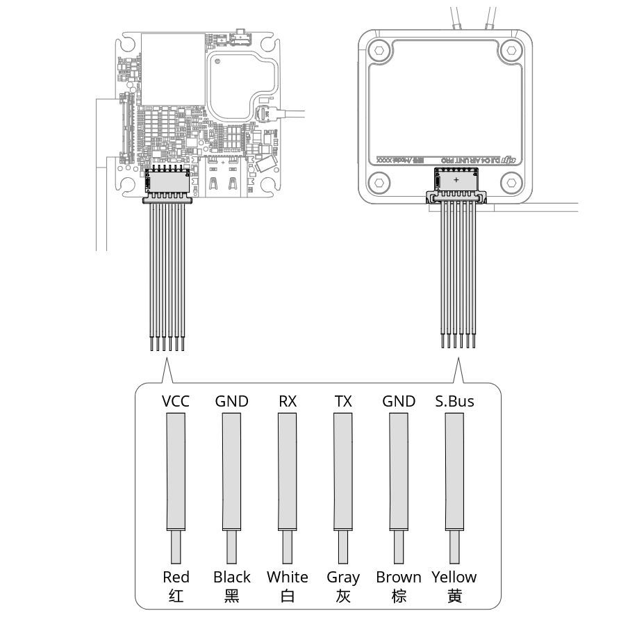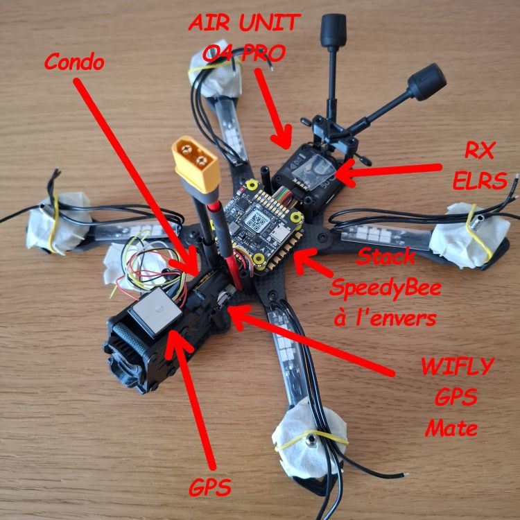 olra72 Posté(e) Juillet 19 Signaler Posté(e) Juillet 19 (modifié) Bonjour, Ci-joint ma proposition de placement d'un build 6S à base de SpeedyBee (montée à l'envers, sortie pigtail à l'avant) avec, à l'arrière une Air Unit O4 Pro surmontée d'un RX ELRS. Du coup l'antenne du RX sors juste en dessous des deux antennes de l'O4. Devant, sur la bottom plate, un Vifly GPS Mate avec son buzer, dessus le condo et, au-dessus de la caméra (TPU à prévoir) le GPS M10 Glonass TBS. Du coup, l'arrivée des signaux du Air Unit est juste en dessous de la pigtail et tout près du condo ... mais difficile de faire autrement. A votre avis, c'est "sain" comme disposition ???? J'ai le fer à souder qui chauffe ... il me reste juste à lever un un doute sur le câble et le connecteur fournit pour la connexion Air Unit / FC. J'ai un câble avec un premier GND noir et un deuxième GND rouge terne (ou marron). Sur le schéma de câblage, les deux GND sont liés ensembles et arrivent sur une seule pin à souder ... mais j'aimerai vérifier que le connecteur (à plugger) respecte bien la même logique. Je vais me replonger dans la doc du SpeedyBee ... ça doit bien être spécifié quelque part ... Bises à tous, ... Voila les docs des connecteurs des deux cotés ... on dirait que ça colle ... et le "rouge terne" doit être le "Brown" à savoir le deuxième Ground ... et les TX/RX sont bien croisés ... Vous confirmez ? Modifié (le) Juillet 19 par olra72