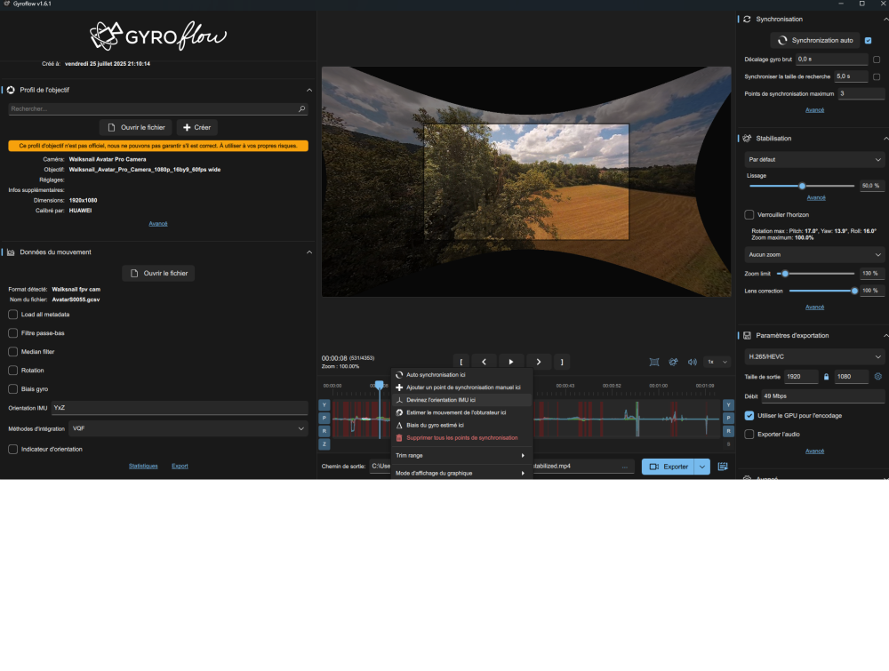 Wanegain Posté(e) Juillet 25 Signaler Posté(e) Juillet 25 Je me suis rendu compte aussi que mon gyro n'était pas dans le bon sens dans gyroflow. Pour que gyroflow trouve l'orientation lui même, il suffit de faire un clic droit dans la timeline et de cliquer sur "Devinez l'orientation IMU ici". Il m'a remis les axes dans le bon ordre et dans le bon sens. 1