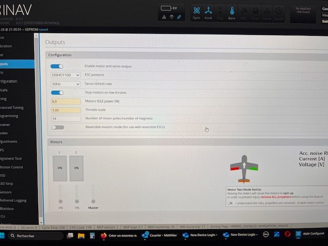 mattmattou Posté(e) Juillet 28 Signaler Posté(e) Juillet 28 Bonjour! Ca faisait un petit moment que je n'avais pas mis les pieds ici Je sollicite votre aide car j'ai fait l’acquisition d'une aile Penguin Atomrc, et le soucis c'est que je n'ai aucun démarrage moteur, Je n'ai pas de gps dessus (mais c'est prévu) J'ai configuré un inter pour l'armement, la FC est une Speedybee Wing mini F405 J'arme puis les esc se mettent a biper et rien ne se passe sur les gaz quand je bouge le stick du throttle Autre chose aussi, quand je teste les moteurs sur Inav avec les curseurs ils marchent! Si vous avez une idée? Bonne soirée Merci! :) Je crois que j'ai trouvé, en fait j'avais mis l'autolaunch dans les modes mais pour l'utiliser il faut le GPS, du coup ça empêchait le démarrage